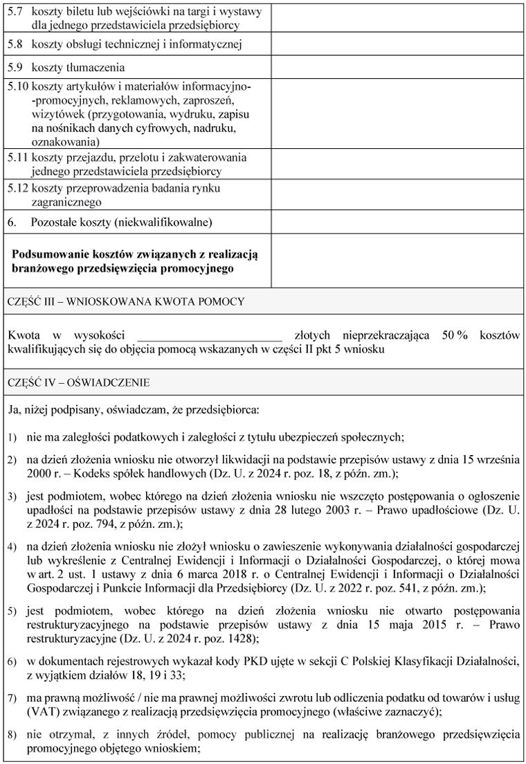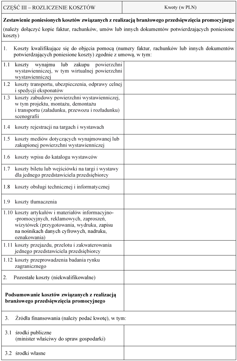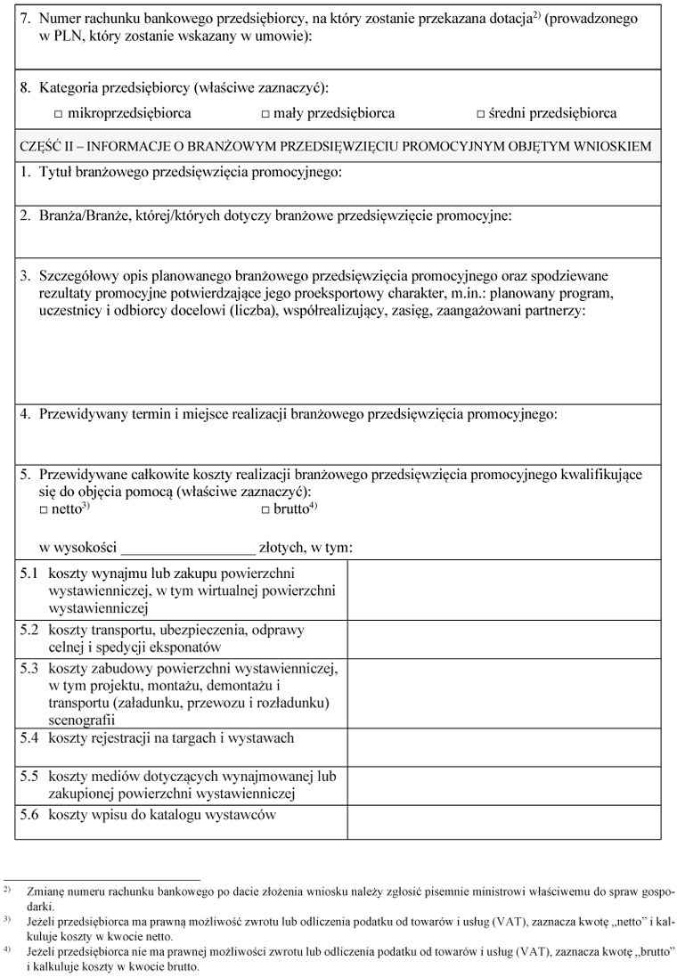 [13] Załącznik nr 2 w brzmieniu ustalonym przez § 1 pkt 6 rozporządzenia Rady Ministrów z dnia 16 grudnia 2024 r. zmieniającego rozporządzenie w sprawie udzielania pomocy de minimis na realizację branżowych przedsięwzięć promocyjnych wspierających eksport (Dz.U. poz. 1867). Zmiana weszła w życie 18 grudnia 2024 r.