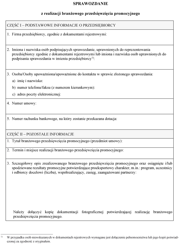 2. Przedsiębiorca składa sprawozdanie z realizacji branżowego przedsięwzięcia promocyjnego, zwane dalej „sprawozdaniem”, wraz z kopiami dokumentów potwierdzających poniesione koszty.