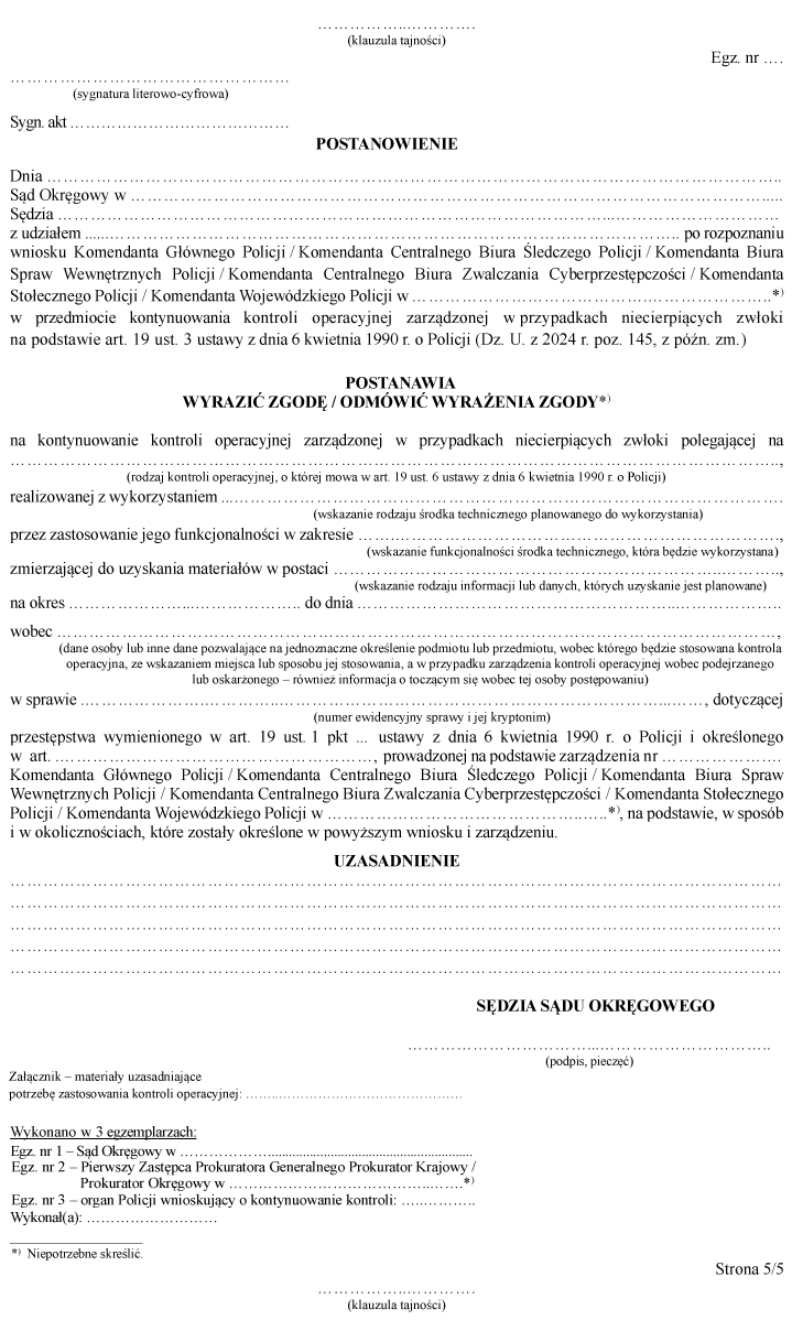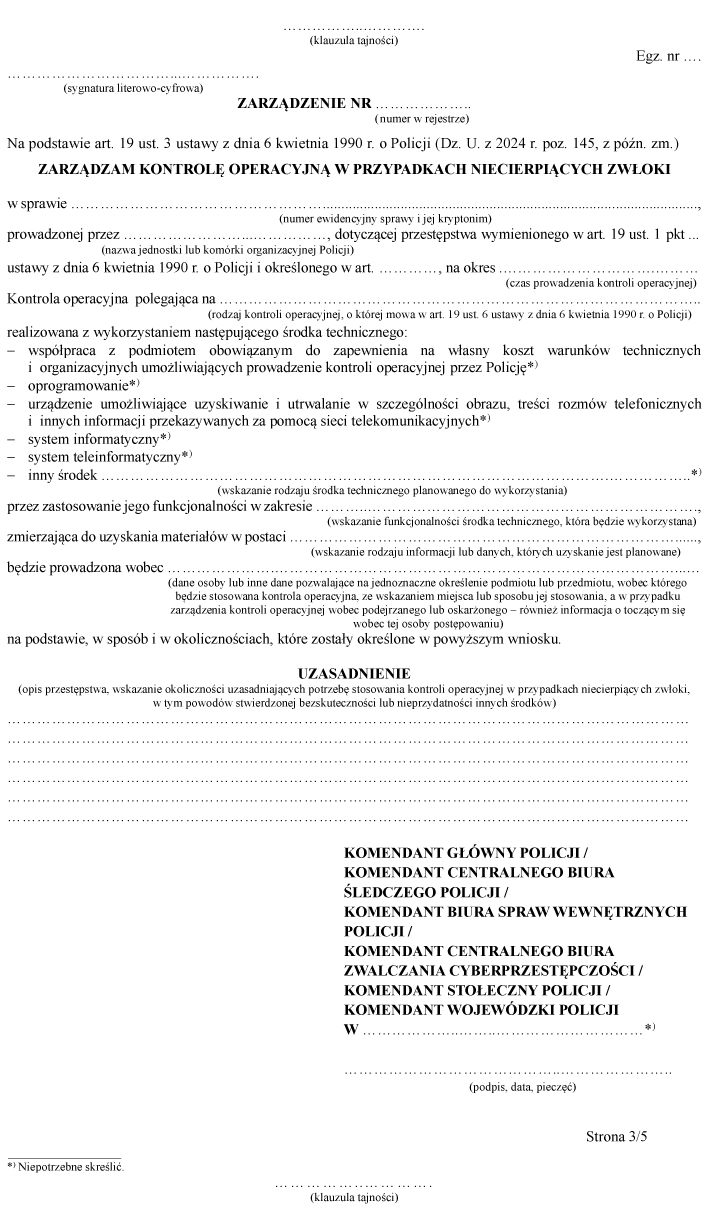 [12] Załącznik nr 3 w brzmieniu ustalonym przez § 1 pkt 2 rozporządzenia Ministra Spraw Wewnętrznych i Administracji z dnia 27 marca 2025 r. zmieniającego rozporządzenie w sprawie kontroli operacyjnej prowadzonej przez Policję (Dz.U. poz. 436). Zmiana weszła w życie 18 kwietnia 2025 r.
