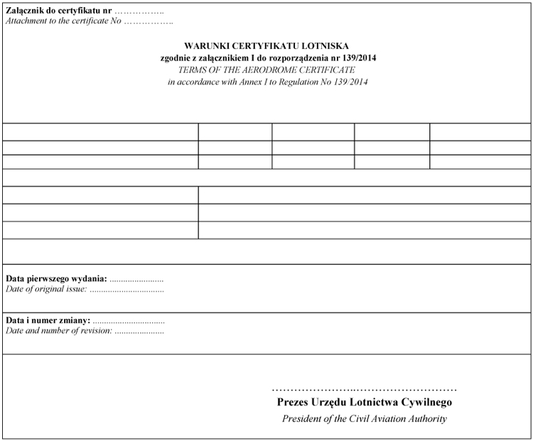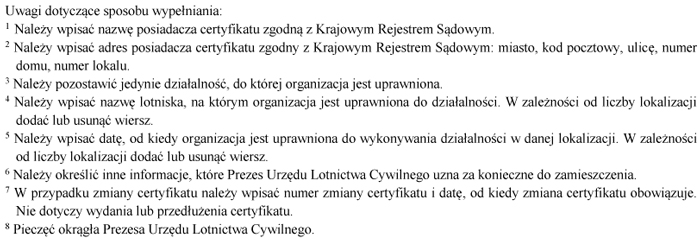 [15] Załącznik nr 6 w brzmieniu ustalonym przez § 1 pkt 9 rozporządzenia Ministra Infrastruktury z dnia 18 listopada 2025 r. zmieniającego rozporządzenie w sprawie certyfikacji działalności w lotnictwie cywilnym (Dz.U. poz. 1710). Zmiana weszła w życie 20 grudnia 2025 r.