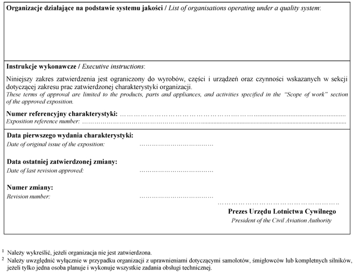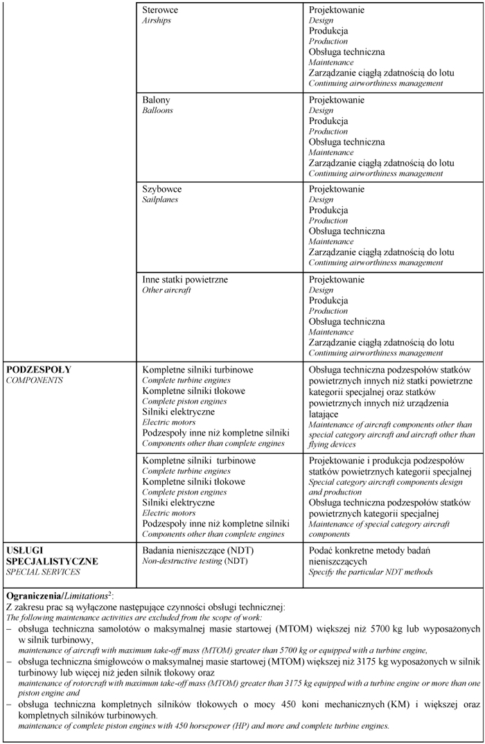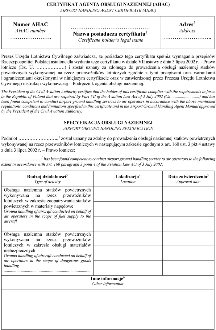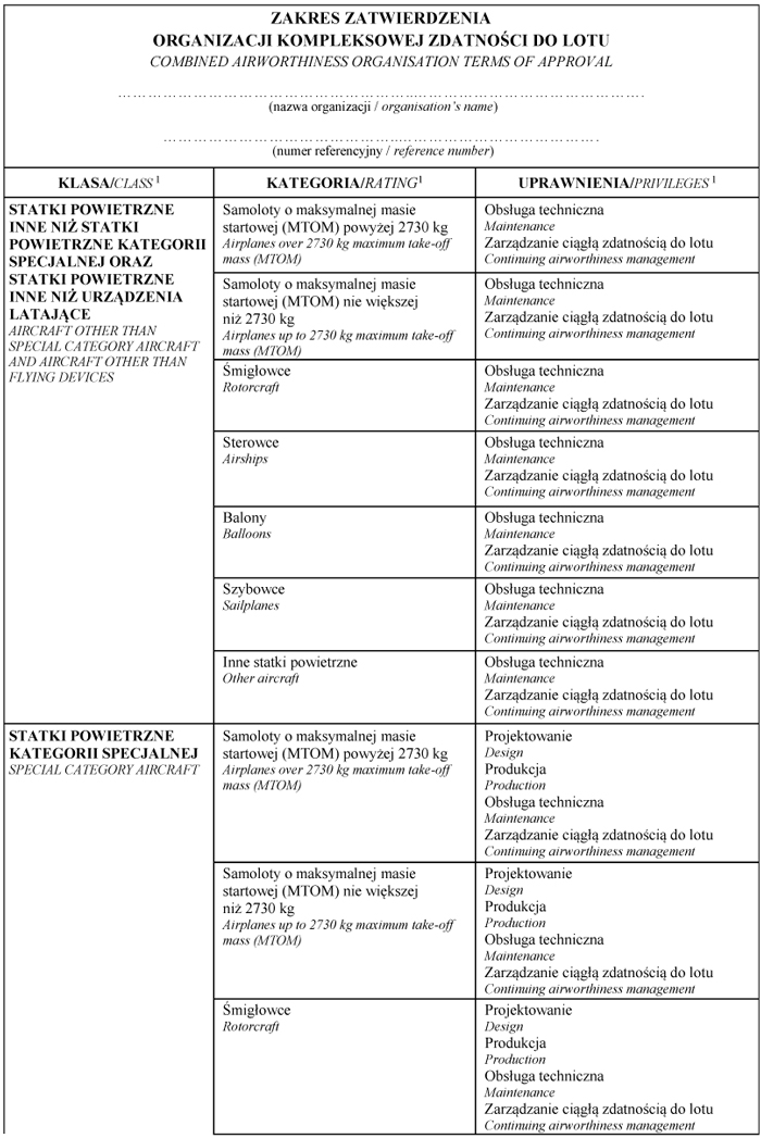 [13] Załącznik nr 3 w brzmieniu ustalonym przez § 1 pkt 7 rozporządzenia Ministra Infrastruktury z dnia 18 listopada 2025 r. zmieniającego rozporządzenie w sprawie certyfikacji działalności w lotnictwie cywilnym (Dz.U. poz. 1710). Zmiana weszła w życie 20 grudnia 2025 r.