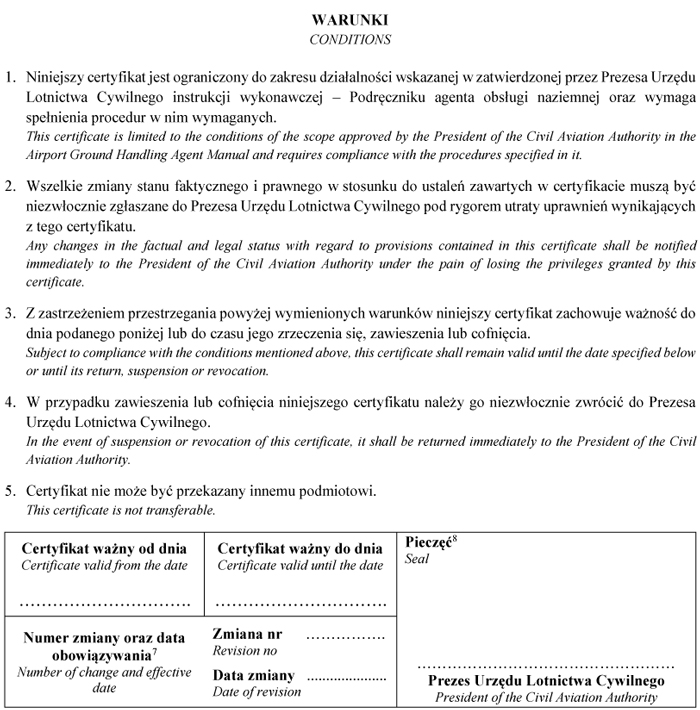 WZÓR - CERTYFIKAT PRZEWOŹNIKA LOTNICZEGO