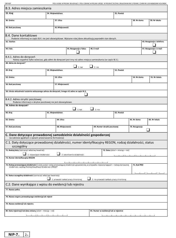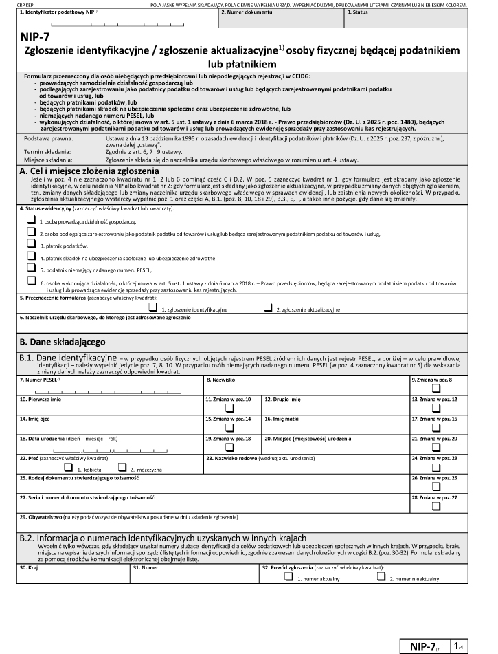 2) zgłoszenia identyfikacyjnego/zgłoszenia aktualizacyjnego osoby fizycznej będącej podatnikiem lub płatnikiem (NIP-7), stanowiący załącznik nr 2 do rozporządzenia;