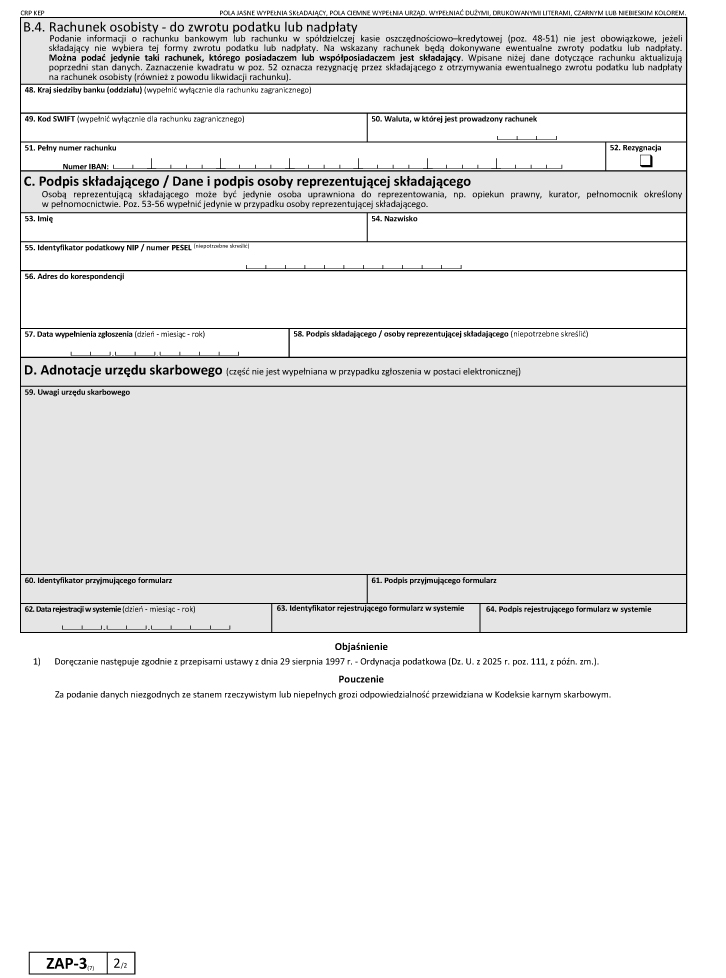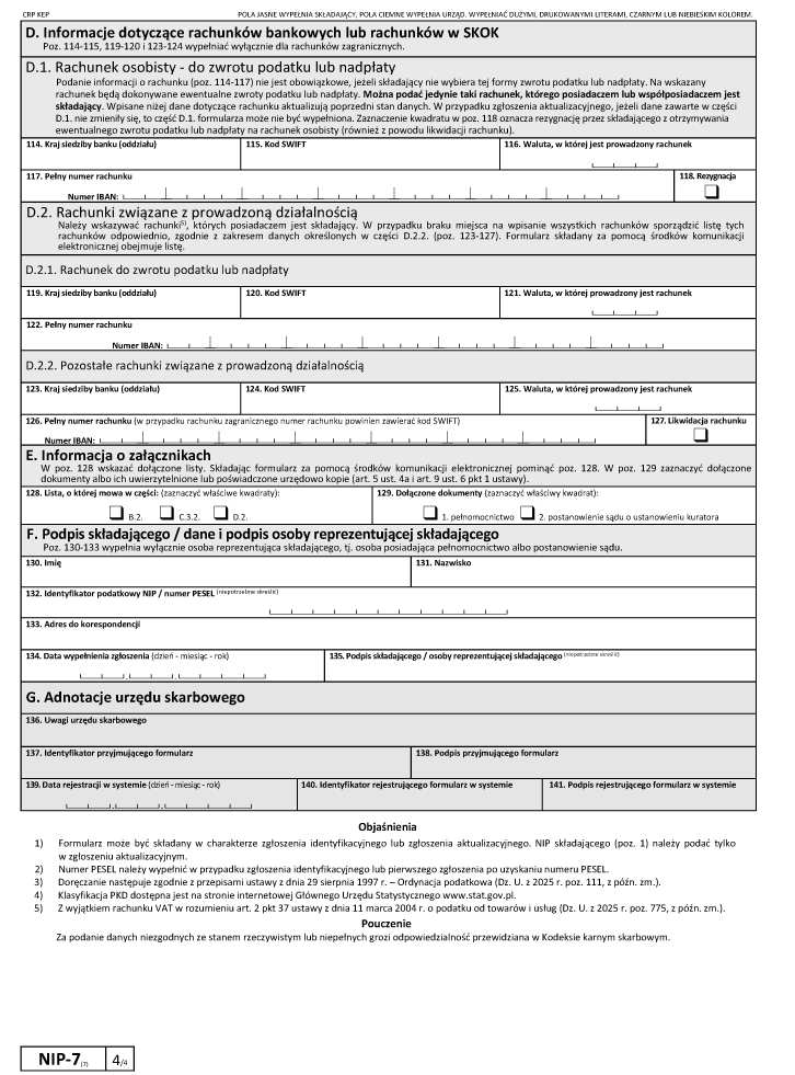 [1] Załącznik nr 2 w brzmieniu ustalonym przez § 1 rozporządzenia Ministra Finansów i Gospodarki z dnia 26 listopada 2025 r. zmieniającego rozporządzenie w sprawie wzorów formularzy zgłoszeń identyfikacyjnych i zgłoszeń aktualizacyjnych oraz zgłoszeń w zakresie danych uzupełniających (Dz.U. poz. 1681). Zmiana weszła w życie 1 stycznia 2026 r.