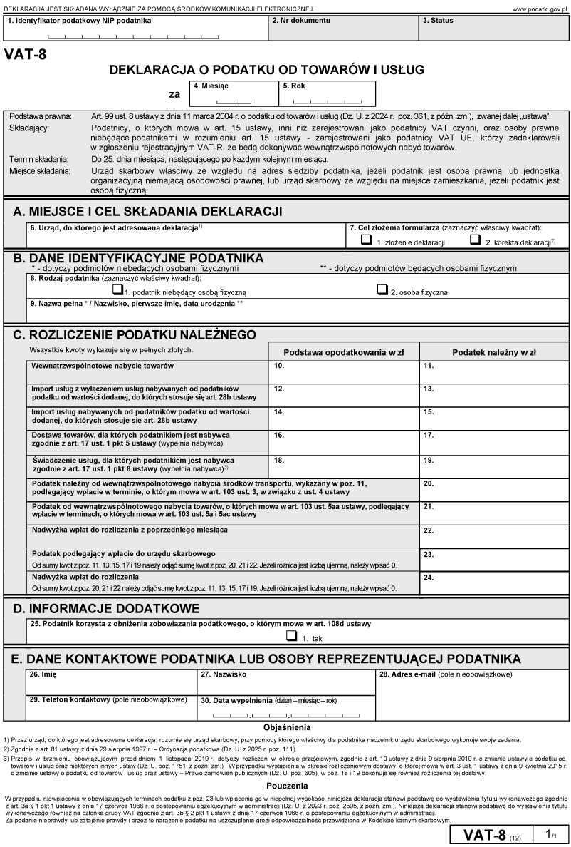 1) deklaracji o podatku od towarów i usług (VAT-8), o której mowa w art. 99 ust. 8 ustawy z dnia 11 marca 2004 r. o podatku od towarów i usług, wraz z objaśnieniami, stanowiący załącznik nr 1 do rozporządzenia;