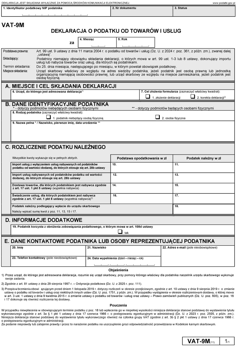2) deklaracji o podatku od towarów i usług (VAT-9M), o której mowa w art. 99 ust. 9 ustawy z dnia 11 marca 2004 r. o podatku od towarów i usług, wraz z objaśnieniami, stanowiący załącznik nr 2 do rozporządzenia.