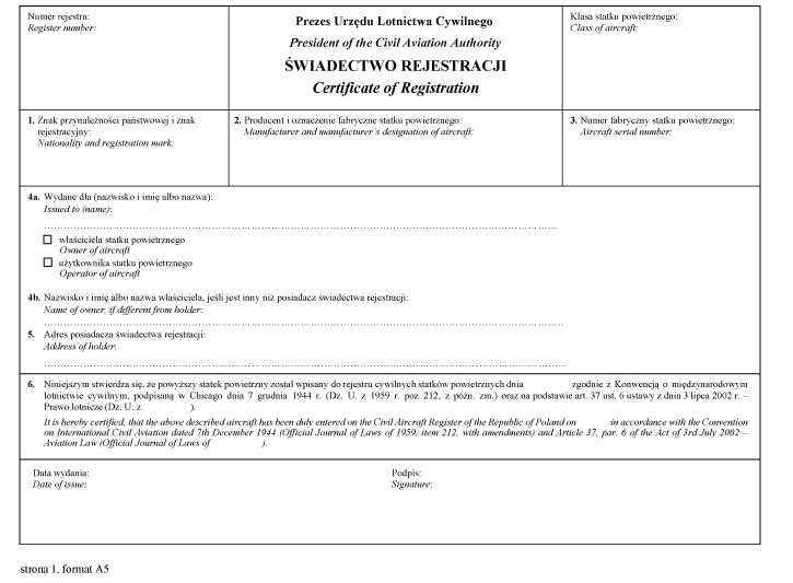 c) świadectwo rejestracji - w przypadku gdy zostało przekazane Prezesowi Urzędu Lotnictwa Cywilnego, zwanemu dalej „Prezesem Urzędu”,
