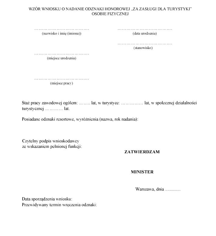 WZÓR WNIOSKU O NADANIE ODZNAKI HONOROWEJ „ZA ZASŁUGI DLA TURYSTYKI” OSOBIE FIZYCZNEJ