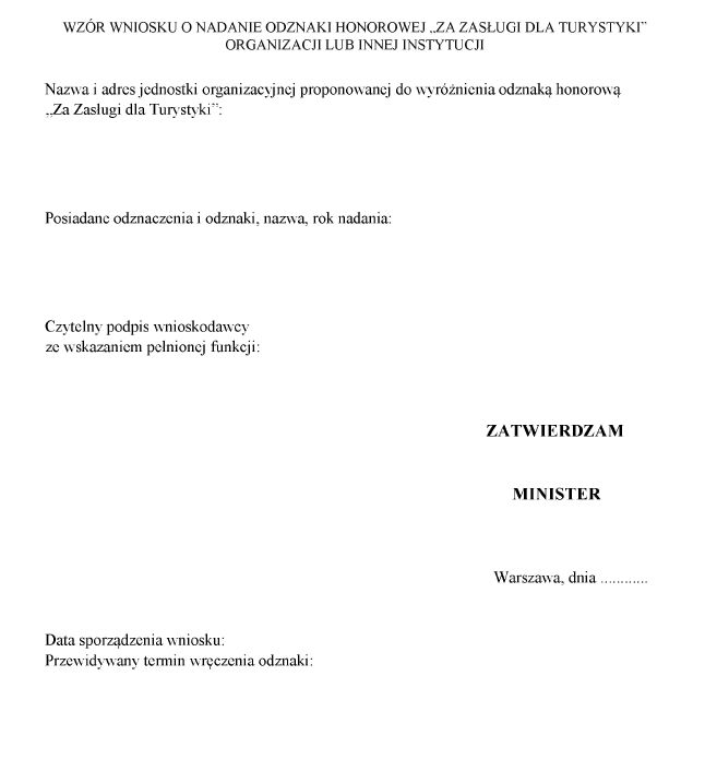 WZÓR WNIOSKU O NADANIE ODZNAKI HONOROWEJ „ZA ZASŁUGI DLA TURYSTYKI” ORGANIZACJI LUB INNEJ INSTYTUCJI