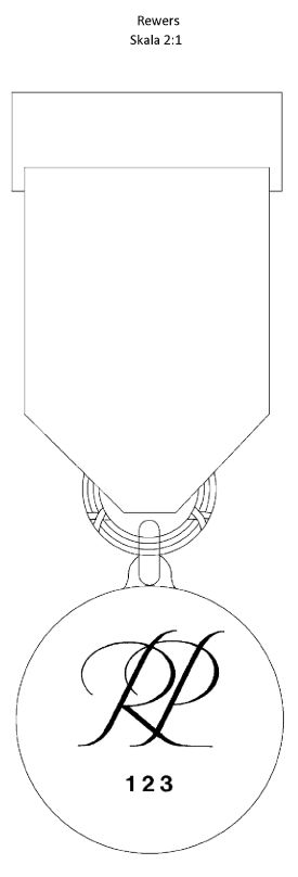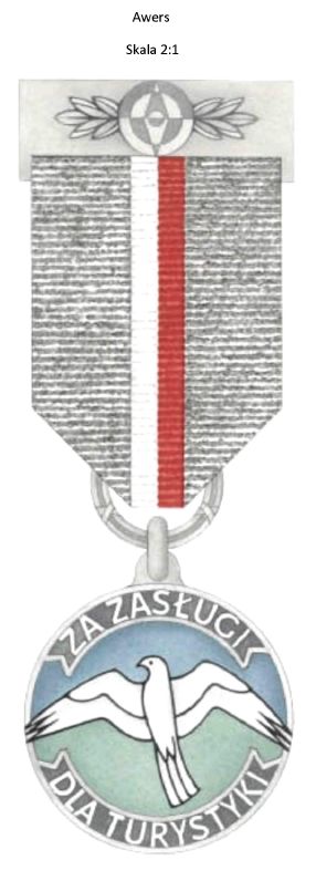 § 4. [Wzór odznaki] 1. Odznakę stanowi okrągły medal o średnicy 33 mm w kolorze srebrnym, wykonany w metalu. Pośrodku strony licowej widnieje stylizowany, biało emaliowany wizerunek sokoła wędrownego o rozpostartych skrzydłach, dzielących powierzchnię medalu na dwie części: górną, pokrytą emalią niebieską, z biegnącym powyżej łukiem napisem: „ZA ZASŁUGI” i dolną, pokrytą emalią zieloną, z umieszczonym niżej biegnącym łukiem napisem: „DLA TURYSTYKI”. Na odwrotnej stronie medalu, pośrodku, jest umieszczony stylizowany monogram „RP”, poniżej wyodrębnione miejsce na numer kolejny nadanej odznaki. U góry medalu uszko, pierścień i kółko, do zawieszenia na wstążce. Wstążka o szerokości 30 mm wykonana z rypsu jedwabnego, z biało-czerwonym paskiem szerokości 6 mm pośrodku i bocznymi paskami w kolorze srebrnym o równej szerokości 12 mm. Wstążka górą jest przeciągnięta przez podłużny otwór w metalowej listewce wysokości 12 mm i szerokości 33 mm, w kolorze srebrnym, ze stylizowanym wizerunkiem kompasu, po którego bokach widnieją pojedyncze gałązki wawrzynu o pięciu listkach; na odwrocie listewki jest zamocowane zapięcie.