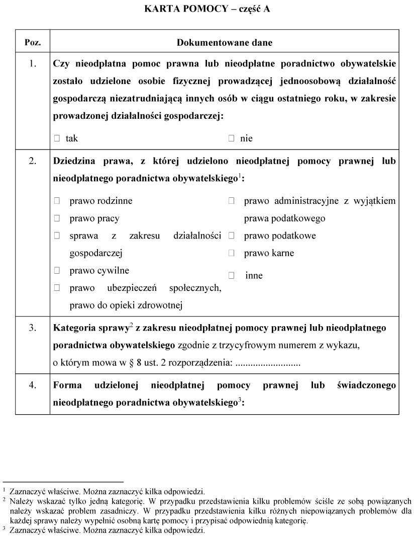 § 8. [Dokumentacja świadczenia nieodpłatnej pomocy prawnej lub nieodpłatnego poradnictwa obywatelskiego] 1. Każdy przypadek udzielania nieodpłatnej pomocy prawnej lub świadczenia nieodpłatnego poradnictwa obywatelskiego dokumentuje się przez wypełnienie karty pomocy, której wzór jest określony w załączniku nr 2 do rozporządzenia. Karta pomocy składa się z części A i części B.