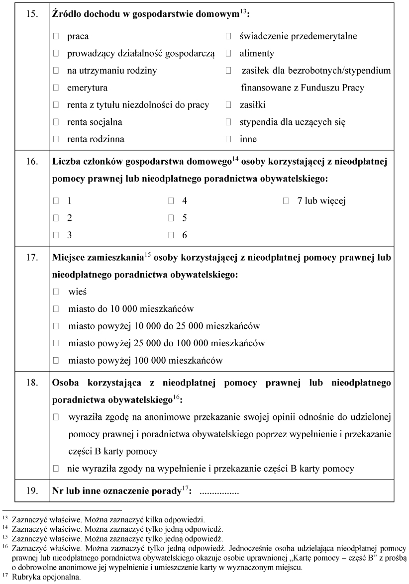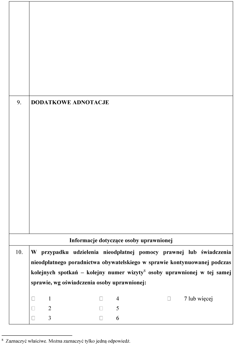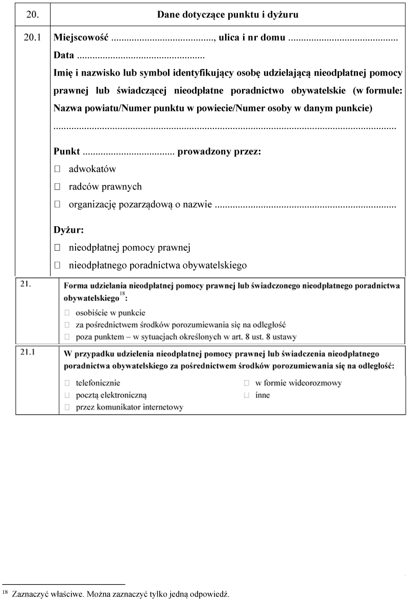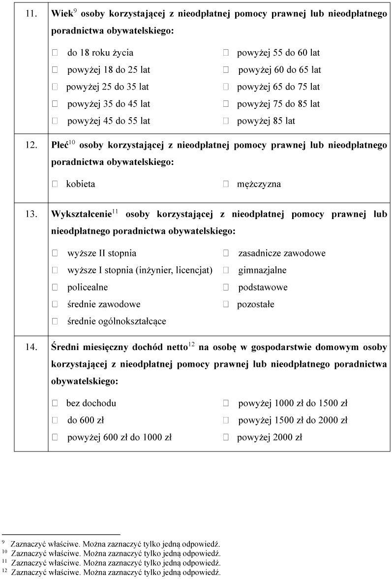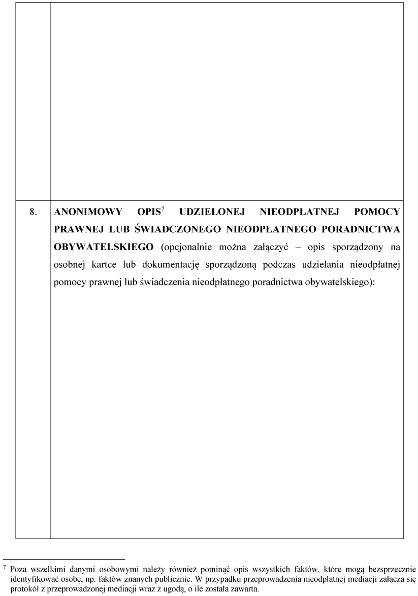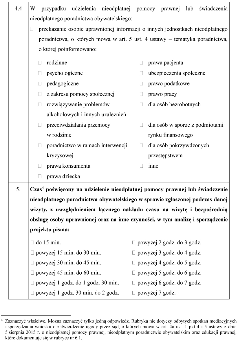 [15] Załącznik nr 4 w brzmieniu ustalonym przez § 1 pkt 7 rozporządzenia Ministra Sprawiedliwości z dnia 13 grudnia 2025 r. zmieniającego rozporządzenie w sprawie nieodpłatnej pomocy prawnej oraz nieodpłatnego poradnictwa obywatelskiego (Dz.U. poz. 1803). Zmiana weszła w życie 1 stycznia 2026 r.