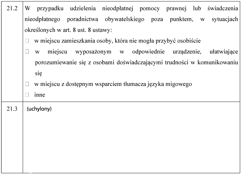 [14] Załącznik nr 2 w brzmieniu ustalonym przez § 1 pkt 6 rozporządzenia Ministra Sprawiedliwości z dnia 13 grudnia 2025 r. zmieniającego rozporządzenie w sprawie nieodpłatnej pomocy prawnej oraz nieodpłatnego poradnictwa obywatelskiego (Dz.U. poz. 1803). Zmiana weszła w życie 1 stycznia 2026 r.