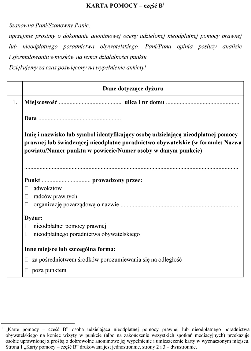 4. Część B karty pomocy, obejmującą opinię osoby uprawnionej o udzielonej nieodpłatnej pomocy prawnej lub świadczonym nieodpłatnym poradnictwie obywatelskim, wypełnia osobiście osoba uprawniona, z wyjątkiem danych zawartych w pkt 1 tej części karty pomocy. Po udzielonej nieodpłatnej pomocy prawnej lub świadczonym nieodpłatnym poradnictwie obywatelskim osobie uprawnionej przekazuje się część B karty pomocy, uprzednio wypełnioną w zakresie danych zawartych w pkt 1, w postaci papierowej lub elektronicznej. Wypełnienie części B karty pomocy, obejmującej opinię osoby uprawnionej, jest dobrowolne.
