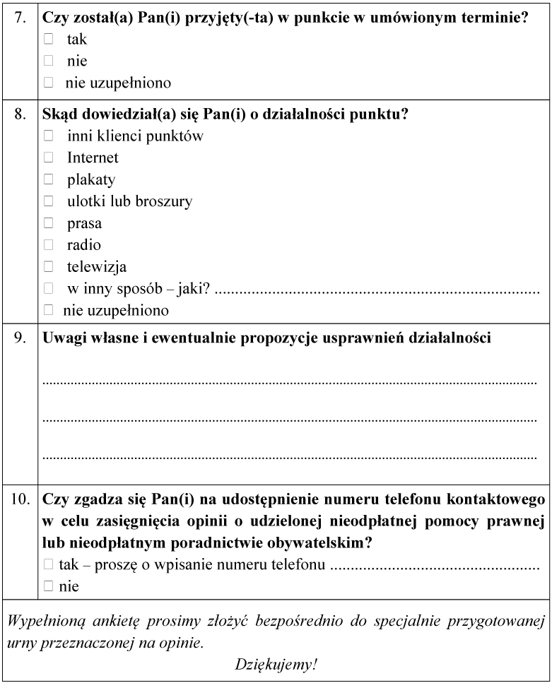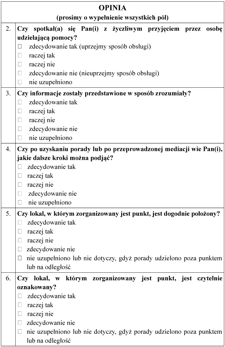 6) informację o możliwości przekazywania przez osoby uprawnione opinii o udzielonej nieodpłatnej pomocy prawnej lub świadczonym nieodpłatnym poradnictwie obywatelskim;