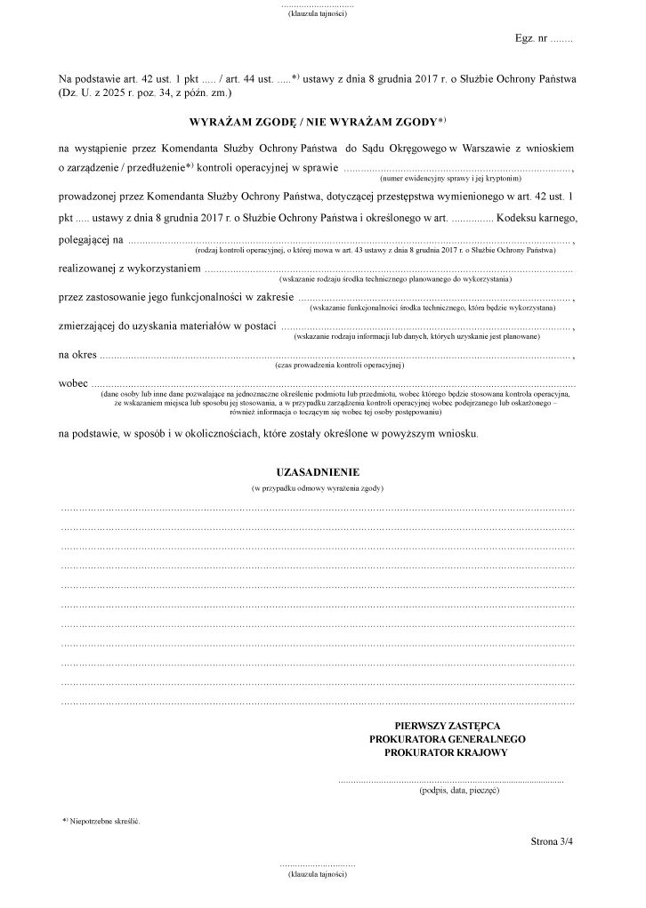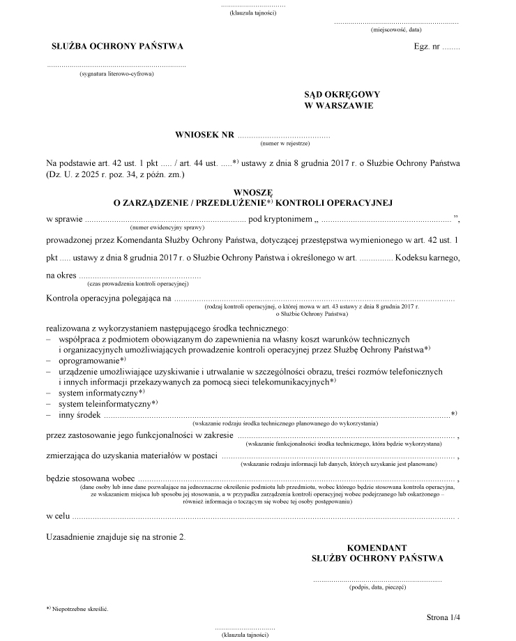 WZÓR WNIOSKU O ZARZĄDZENIE / PRZEDŁUŻENIE KONTROLI OPERACYJNEJ
