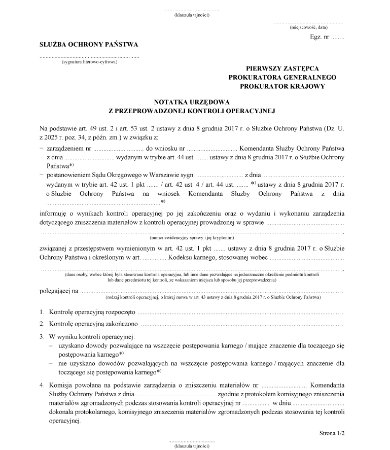 WZÓR NOTATKI URZĘDOWEJ Z PRZEPROWADZONEJ KONTROLI OPERACYJNEJ