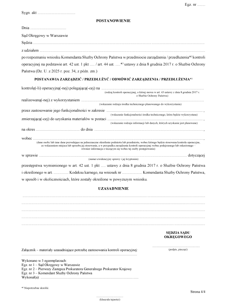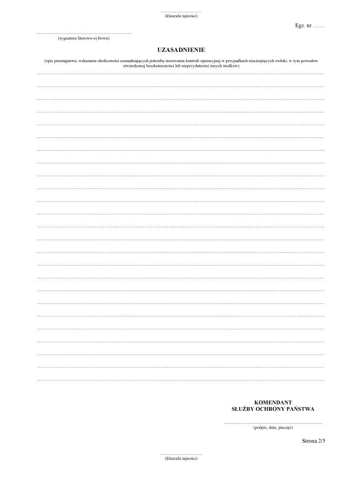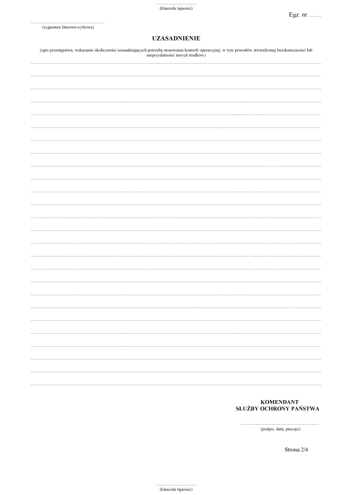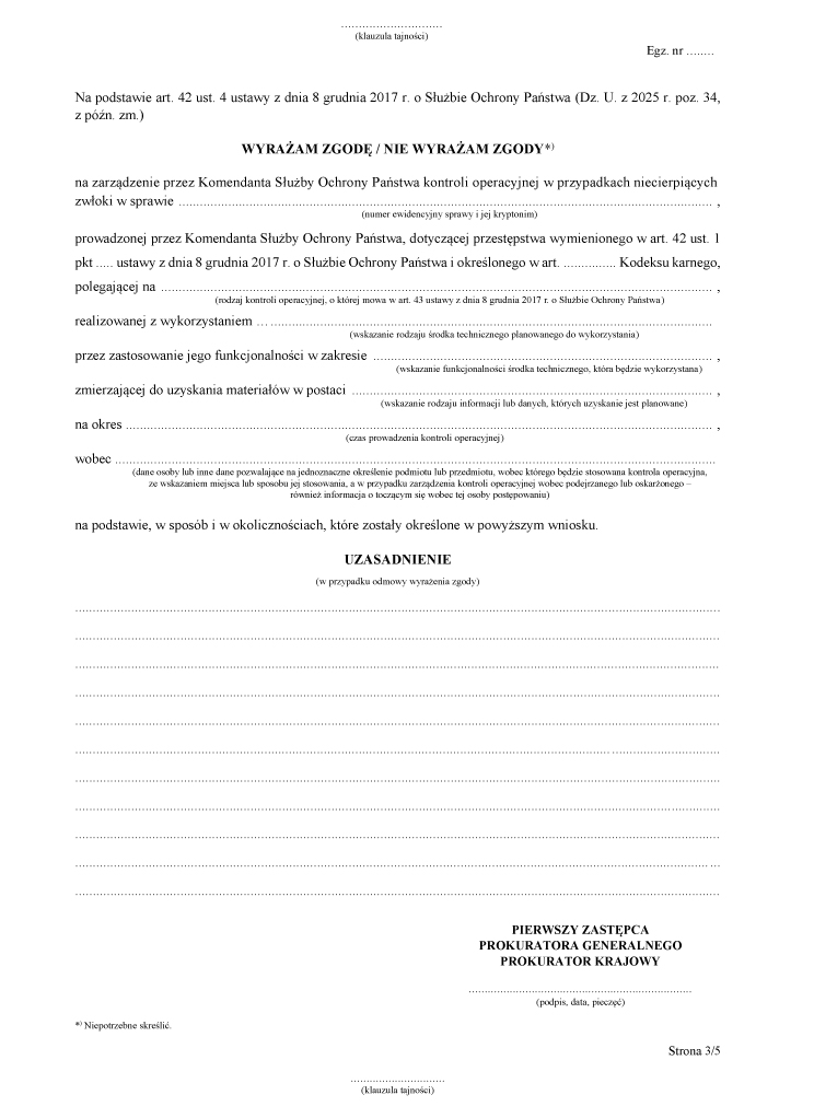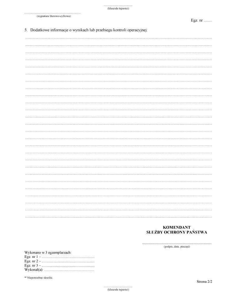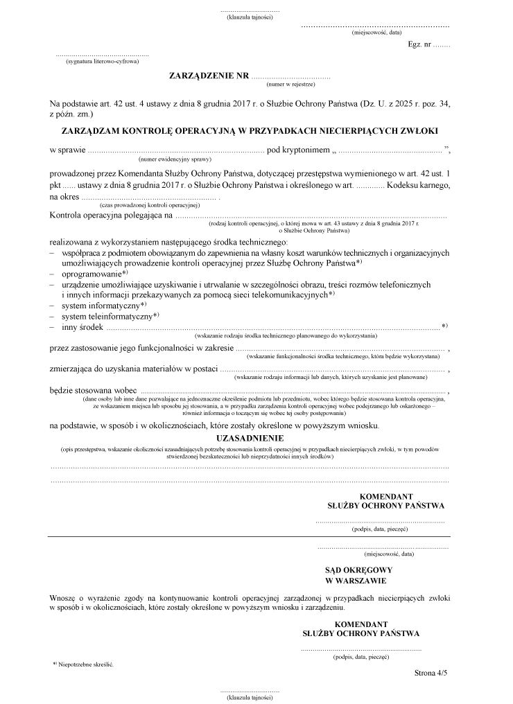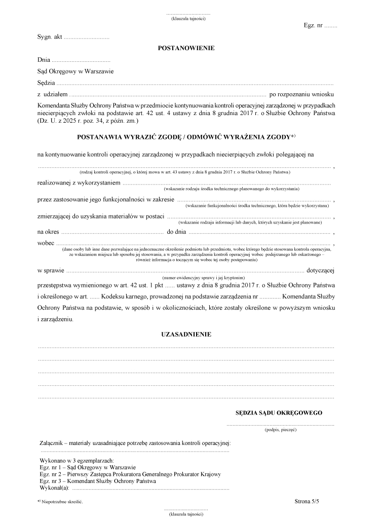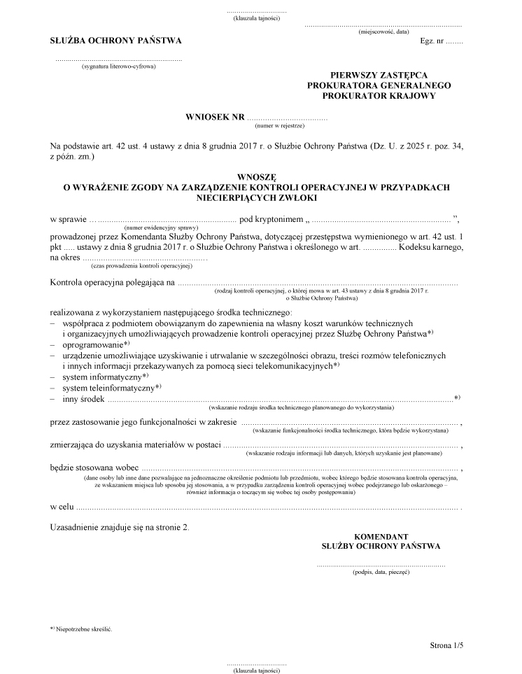 WZÓR WNIOSKU O ZARZĄDZENIE KONTROLI OPERACYJNEJ W PRZYPADKACH NIECIERPIĄCYCH ZWŁOKI