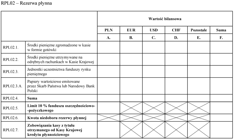 § 1.[Rozporządzenie w sprawie sprawozdań spółdzielczych kas oszczędnościowo-kredytowych oraz Krajowej Spółdzielczej Kasy Oszczędnościowo-Kredytowej] W rozporządzeniu Ministra Rozwoju i Finansów z dnia 28 czerwca 2017 r. w sprawie sprawozdań spółdzielczych kas oszczędnościowo-kredytowych oraz Krajowej Spółdzielczej Kasy Oszczędnościowo-Kredytowej (Dz. U. poz. 1455 oraz z 2023 r. poz. 2786) w załączniku nr 3 wzór formularza sprawozdawczego „RPL02 - Rezerwa płynna” otrzymuje brzmienie określone w załączniku do niniejszego rozporządzenia.
