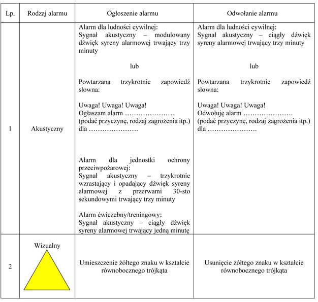 1) rodzaje alarmów oraz sposób ich ogłaszania i odwoływania;