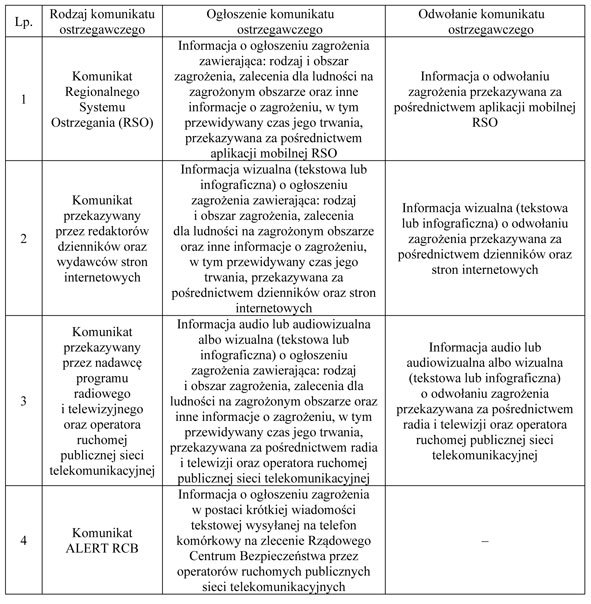 2) rodzaje komunikatów ostrzegawczych oraz sposób ich ogłaszania i odwoływania;
