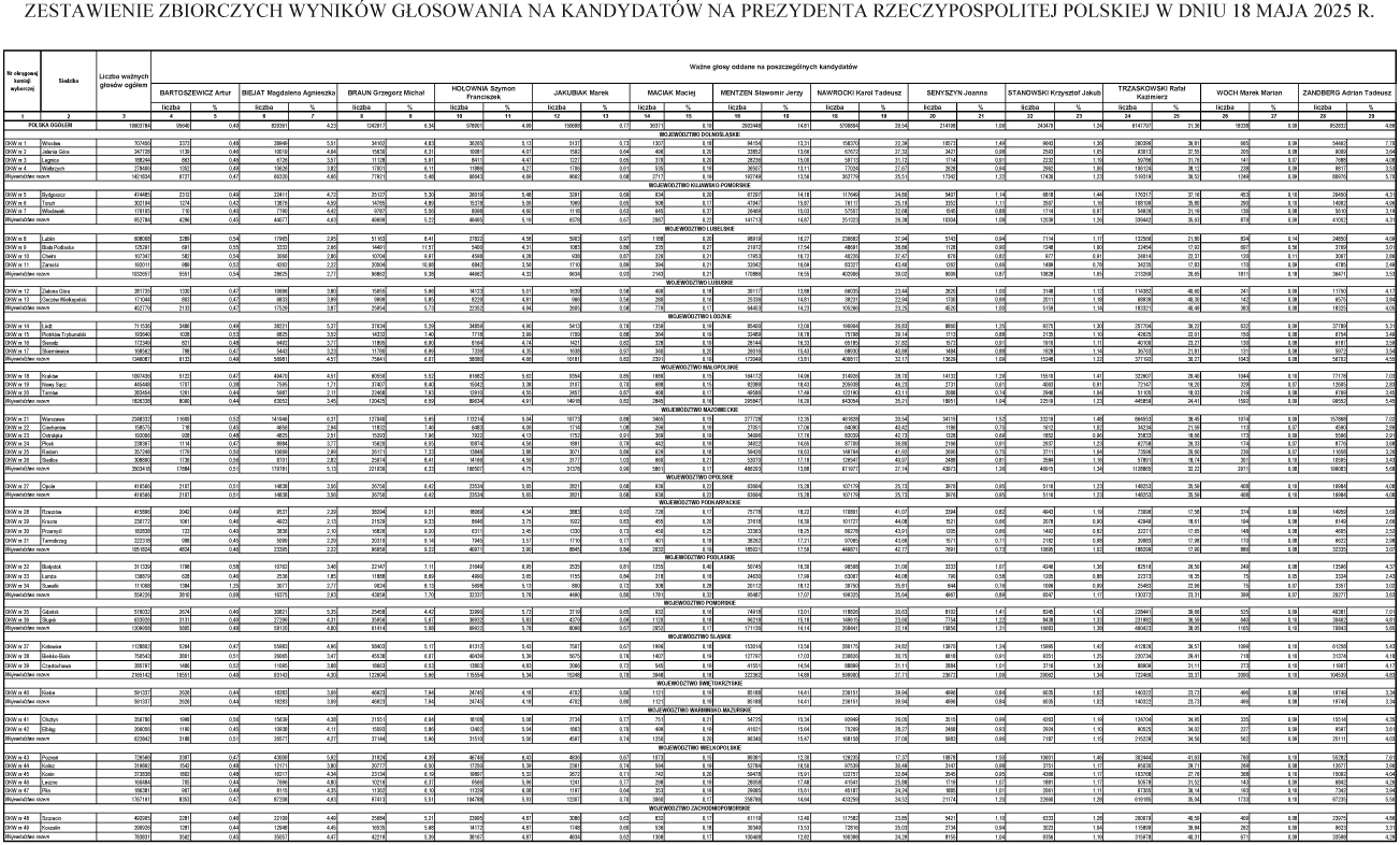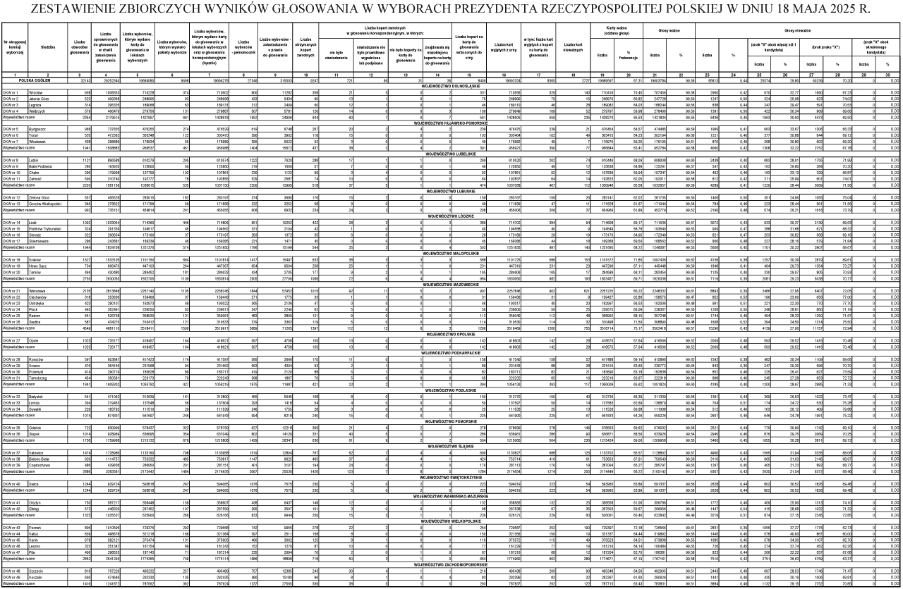 ZESTAWIENIE ZBIORCZYCH WYNIKÓW GŁOSOWANIA NA KANDYDATÓW NA PREZYDENTA RZECZYPOSPOLITEJ POLSKIEJ W DNIU 18 MAJA 2025 R.