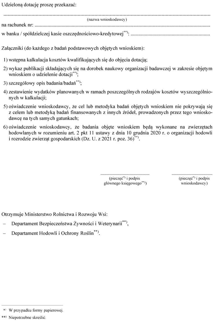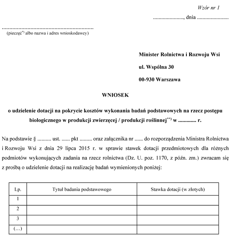 WZÓR - WNIOSEK O UDZIELENIE DOTACJI NA POKRYCIE KOSZTÓW WYKONANIA BADAŃ PODSTAWOWYCH NA RZECZ POSTĘPU BIOLOGICZNEGO W PRODUKCJI ZWIERZĘCEJ / PRODUKCJI ROŚLINNEJ