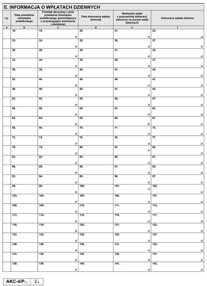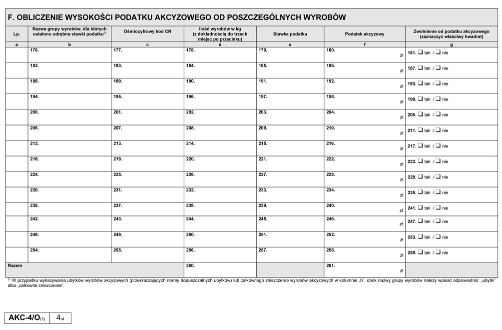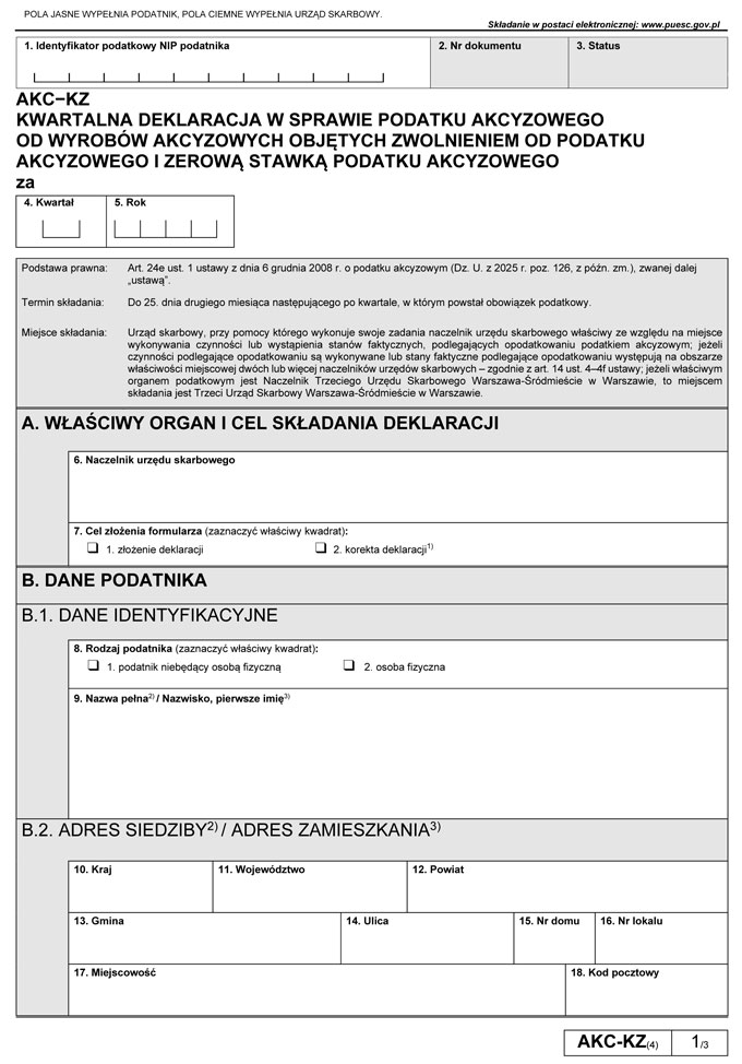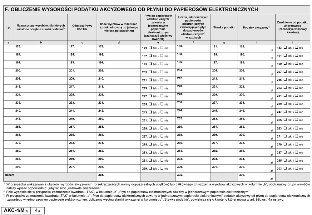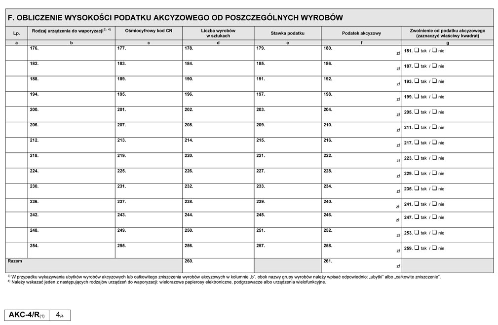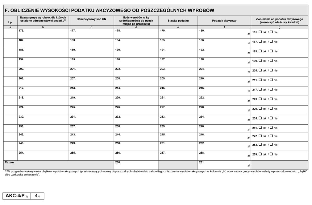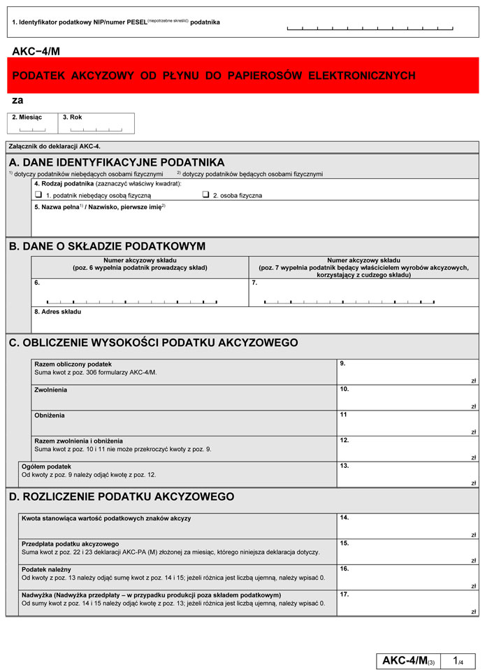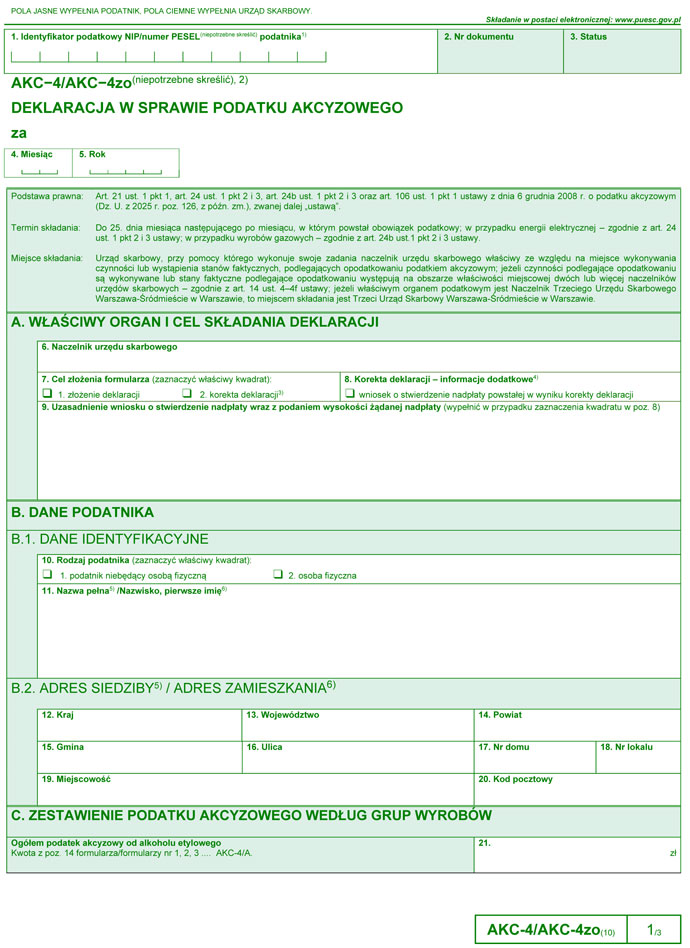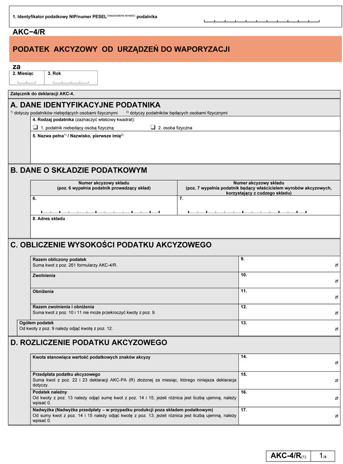 „1. Deklaracje, o których mowa w § 1 pkt 1, składają się z formularza głównego (AKC-4/AKC-4zo), którego wzór określa załącznik nr 1 do rozporządzenia, oraz formularzy szczegółowych o podatku akcyzowym od poszczególnych grup wyrobów akcyzowych oraz samochodów osobowych (AKC-4/A, AKC-4/B, AKC-4/C, AKC-4/D, AKC-4/E, AKC-4/F, AKC-4/H, AKC-4/I, AKC-4/J, AKC-4/K, AKC-4/L, AKC-4/M, AKC-4/N, AKC-4/O, AKC-4/P i AKC-4/R), których wzory określają załączniki nr 2-14c do rozporządzenia.”;