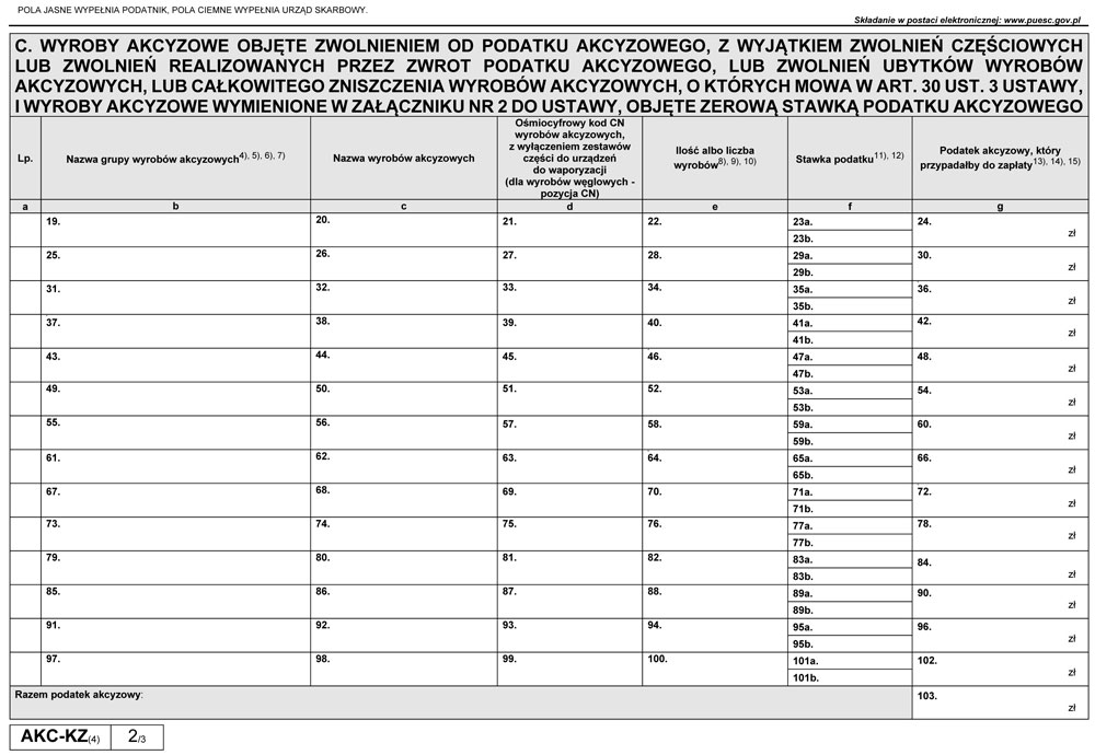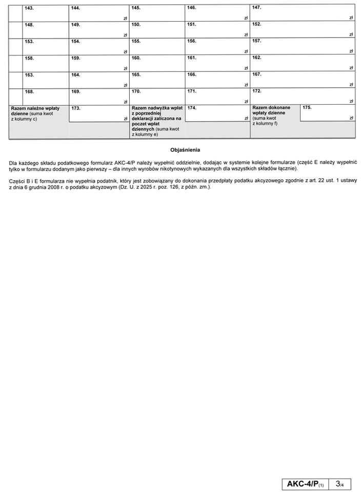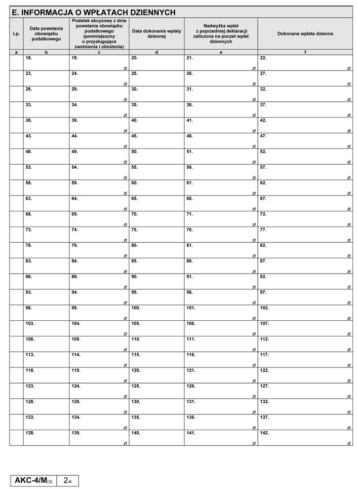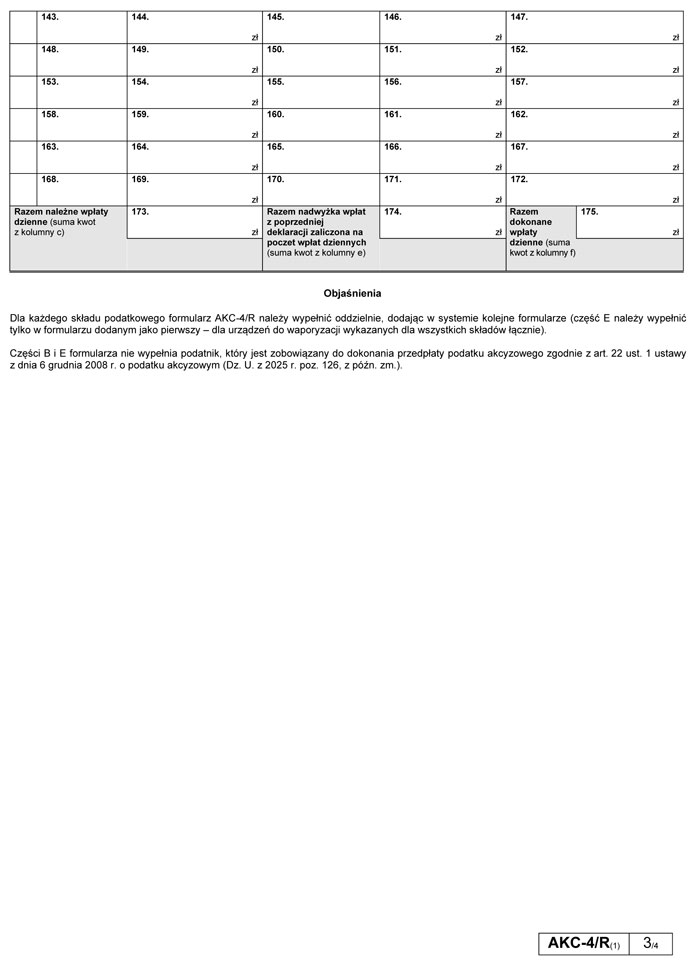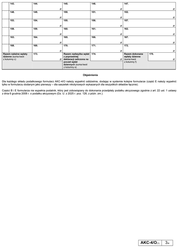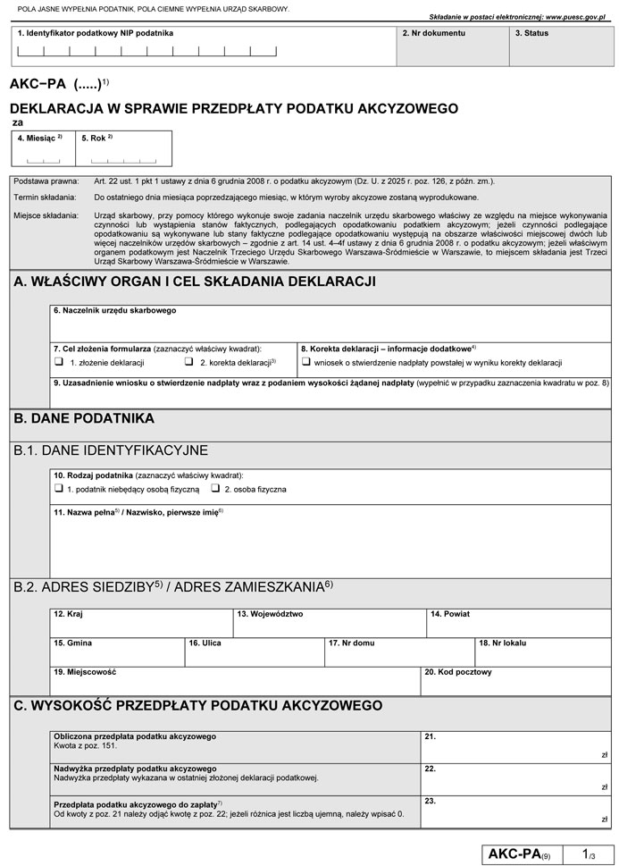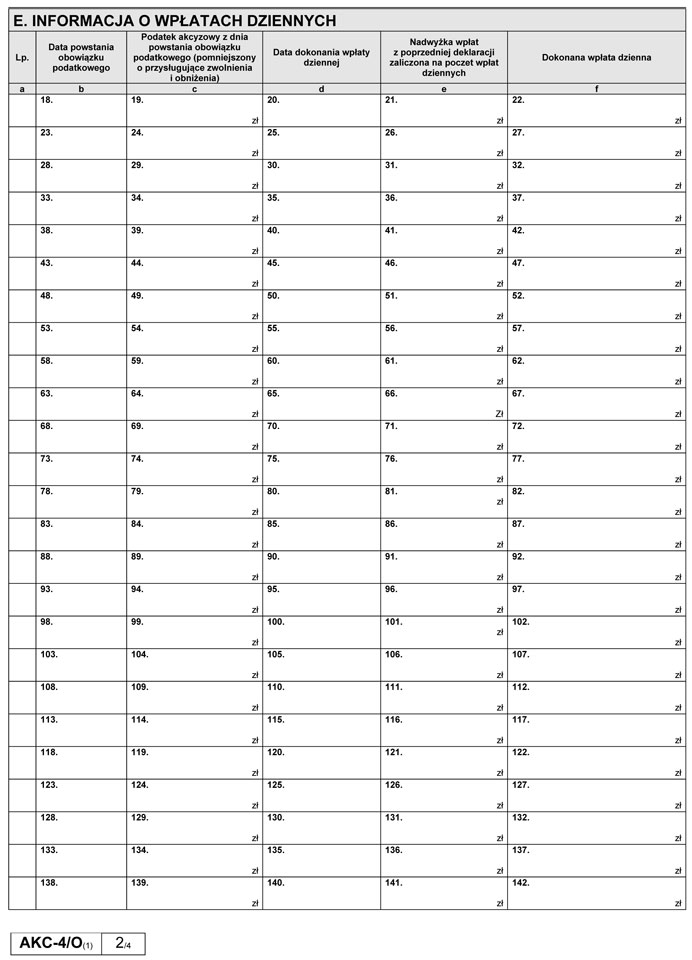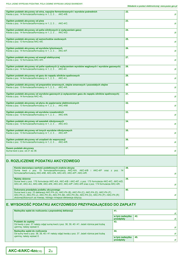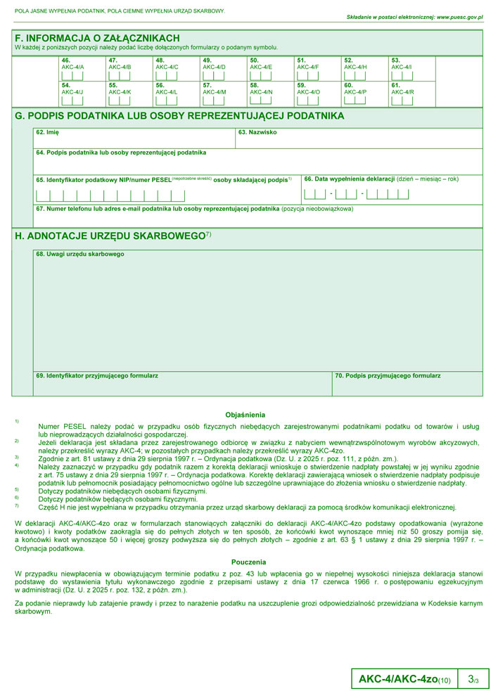„1. Deklaracje, o których mowa w § 1 pkt 1, składają się z formularza głównego (AKC-4/AKC-4zo), którego wzór określa załącznik nr 1 do rozporządzenia, oraz formularzy szczegółowych o podatku akcyzowym od poszczególnych grup wyrobów akcyzowych oraz samochodów osobowych (AKC-4/A, AKC-4/B, AKC-4/C, AKC-4/D, AKC-4/E, AKC-4/F, AKC-4/H, AKC-4/I, AKC-4/J, AKC-4/K, AKC-4/L, AKC-4/M, AKC-4/N, AKC-4/O, AKC-4/P i AKC-4/R), których wzory określają załączniki nr 2-14c do rozporządzenia.”;