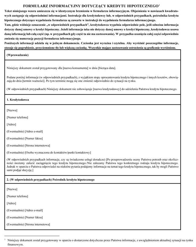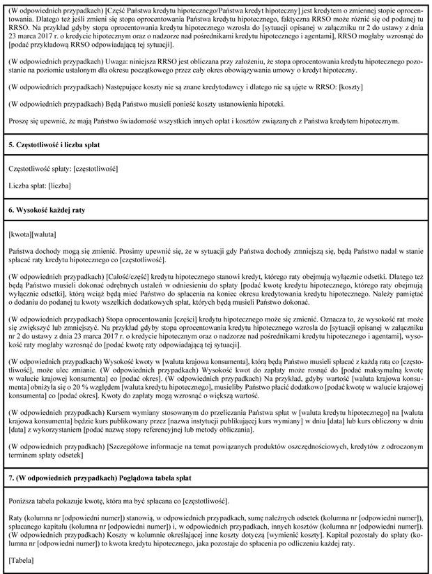 5) Jeśli stopa oprocentowania kredytu hipotecznego podlega zmianom i jest nieznana wysokość raty po każdej zmianie, kredytodawca może podać w tabeli amortyzacji tę samą wysokość raty dla całego okresu kredytowania. W takim przypadku kredytodawca zwraca uwagę konsumentowi na ten fakt poprzez graficzne odróżnienie kwot znanych od kwot hipotetycznych (np. poprzez zastosowanie odmiennej czcionki, obramowań lub przyciemnionego tła). Ponadto czytelny tekst wyjaśnia, w jakich okresach podane w tabeli kwoty mogą ulegać zmianie i dlaczego.