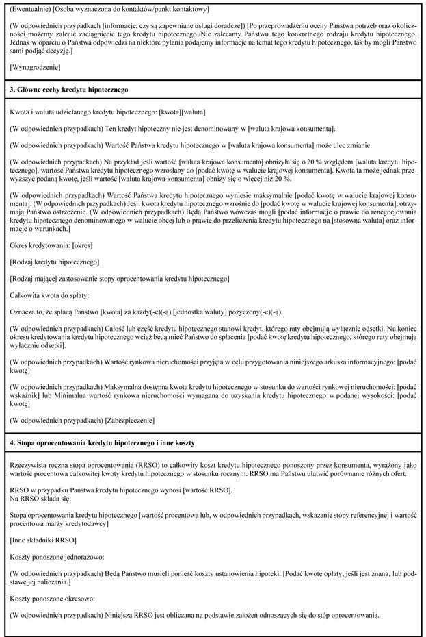 3) Jeżeli dana opcja wiąże się z zaciągnięciem dodatkowego kredytu, należy przedstawić konsumentowi informację o całkowitej kwocie kredytu (w tym kredytu zabezpieczonego hipoteką lub porównywalnym zabezpieczeniem), wyjaśnienie, czy dodatkowy kredyt jest zabezpieczony, czy nie, właściwe stopy oprocentowania oraz wyjaśnienie, czy jest on regulowany. Taka kwota dodatkowego kredytu jest uwzględniana w pierwotnej ocenie zdolności kredytowej, a jeśli tak nie jest, wyjaśnia się, że dostępność dodatkowej kwoty zależy od dodatkowej oceny możliwości spłaty przez konsumenta.