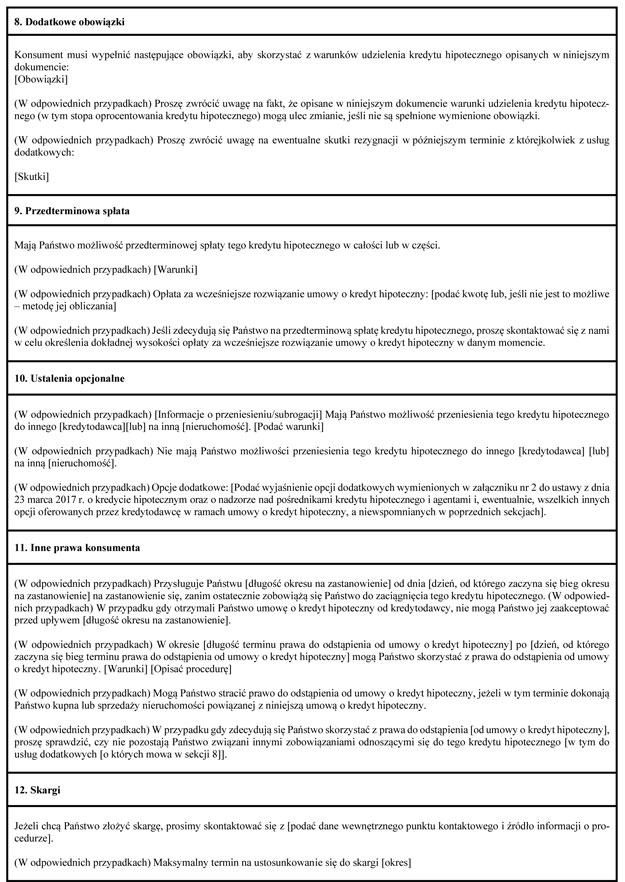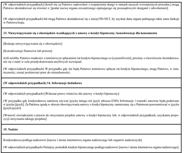 1) Jeśli niewywiązanie się przez konsumenta z któregokolwiek z obowiązków wynikających z umowy o kredyt hipoteczny może mieć dla niego konsekwencje finansowe lub prawne, kredytodawca opisuje różne najpowszechniejsze przypadki (np. opóźnienia w spłacie lub zaległości w spłacie, nieprzestrzeganie obowiązków określonych w sekcji 8) i wskazuje, gdzie można uzyskać bardziej szczegółowe informacje.