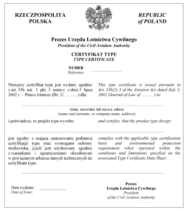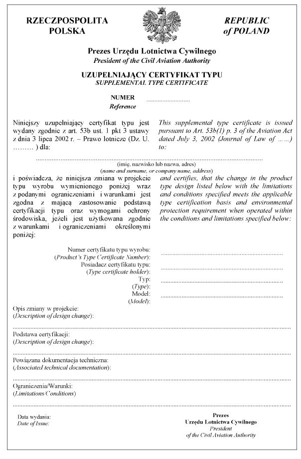 WZÓR UZUPEŁNIAJĄCEGO CERTYFIKATU TYPU