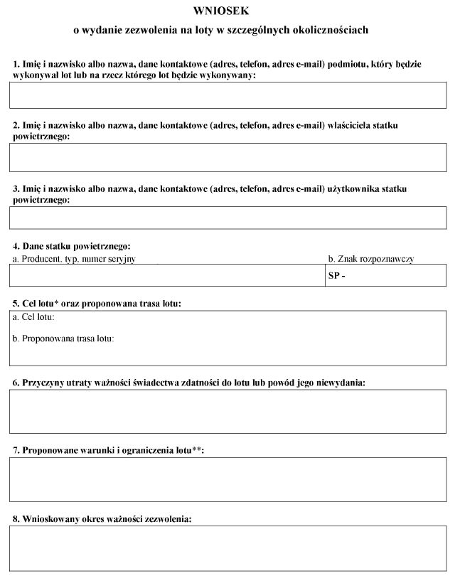 WZÓR WNIOSKU O WYDANIE ZEZWOLENIA NA LOTY W SZCZEGÓLNYCH OKOLICZNOŚCIACH