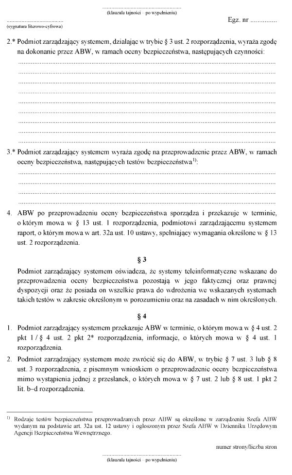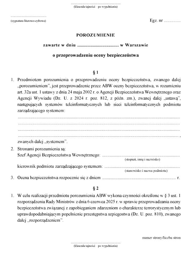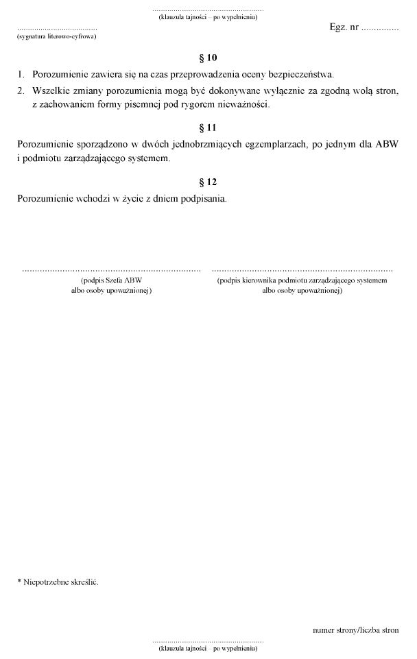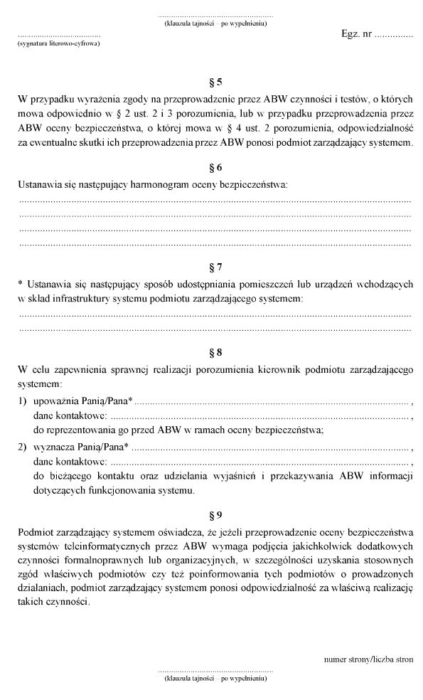 2. ABW w terminie 30 dni od dnia otrzymania informacji, o których mowa w § 4 ust. 1, przekazuje podmiotowi zarządzającemu systemem projekt porozumienia zawierającego ramowe warunki przeprowadzenia oceny bezpieczeństwa, obejmujące w szczególności: