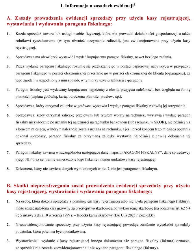 1) sposób prowadzenia ewidencji sprzedaży przy zastosowaniu kas rejestrujących, zwanych dalej ,,kasami”, w tym o zastosowaniu specjalnym dla danego rodzaju czynności, oraz warunki i sposób używania kas, w tym sposób zakończenia używania kas w przypadku zakończenia działalności gospodarczej lub pracy kas, sposób wystawiania dokumentów z kas i szczególne przypadki wydawania nabywcy dowodu sprzedaży oraz rodzaje dokumentów składanych w związku z używaniem kas, sposób ich składania oraz wzory tych dokumentów;