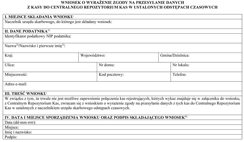 WZÓR - WNIOSEK O WYRAŻENIE ZGODY NA PRZESYŁANIE DANYCH Z KASY DO CENTRALNEGO REPOZYTORIUM KAS W USTALONYCH ODSTĘPACH CZASOWYCH