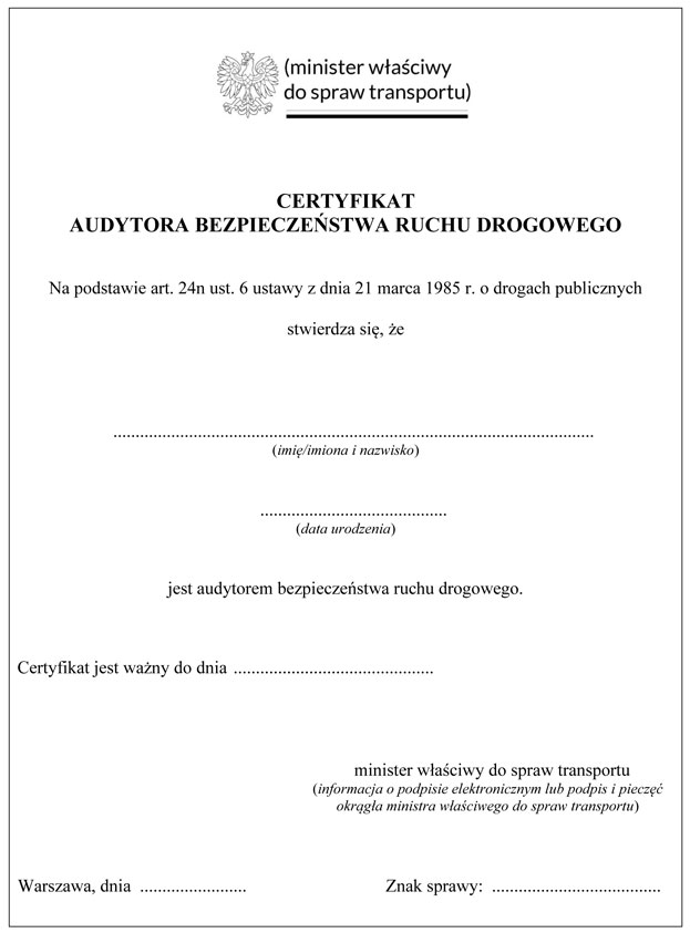 WZÓR CERTYFIKATU AUDYTORA BEZPIECZEŃSTWA RUCHU DROGOWEGO