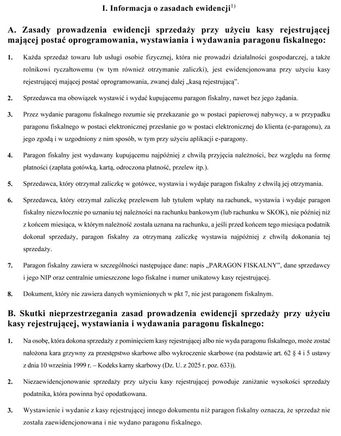 § 1.[Wymagania techniczne dla kas rejestrujących mających postać oprogramowania oraz sposób ich używania] Rozporządzenie określa wymagania techniczne dla kas rejestrujących mających postać oprogramowania, zwanych dalej „kasami”, oraz sposób ich używania, w tym sposób prowadzenia ewidencji sprzedaży przy ich użyciu, sposób zakończenia ich używania w przypadku zakończenia działalności gospodarczej lub pracy kas oraz sposób wystawiania dokumentów z kas i szczególne przypadki wydawania nabywcy dowodu sprzedaży.