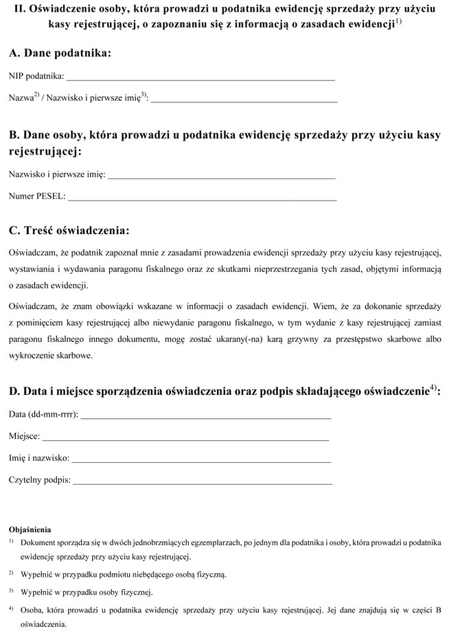 3. Podatnik jest obowiązany zapoznać osobę prowadzącą u niego ewidencję, przed rozpoczęciem jej prowadzenia oraz bez względu na sposób i formę powierzenia tej osobie prowadzenia ewidencji, z informacją o zasadach ewidencji obejmującą podstawowe zasady prowadzenia ewidencji, wystawiania i wydawania paragonu fiskalnego oraz skutki ich nieprzestrzegania.