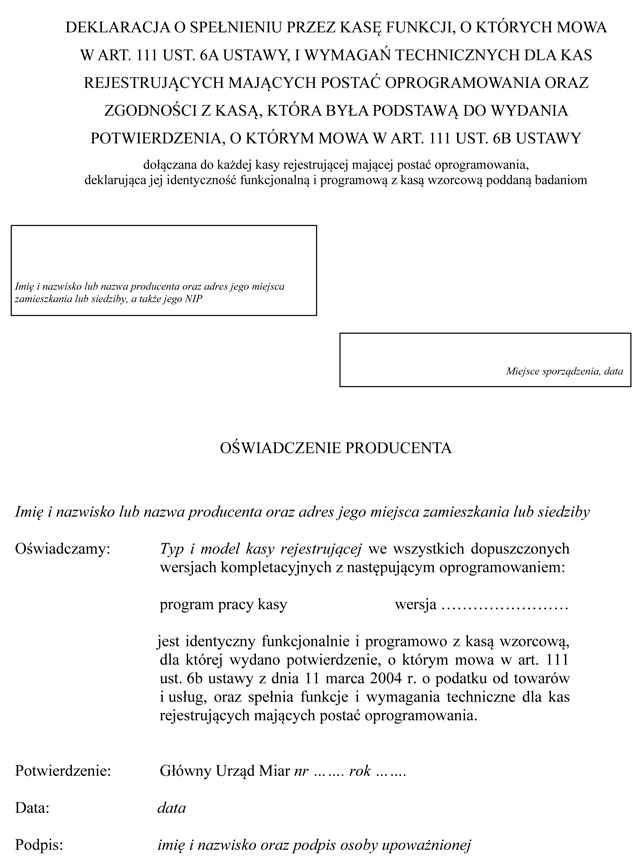 WZÓR - DEKLARACJA O SPEŁNIENIU PRZEZ KASĘ FUNKCJI, O KTÓRYCH MOWA W ART. 111 UST. 6A USTAWY, I WYMAGAŃ TECHNICZNYCH DLA KAS REJESTRUJĄCYCH MAJĄCYCH POSTAĆ OPROGRAMOWANIA ORAZ ZGODNOŚCI Z KASĄ, KTÓRA BYŁA PODSTAWĄ DO WYDANIA POTWIERDZENIA, O KTÓRYM MOWA W ART. 111 UST. 6B USTAWY
