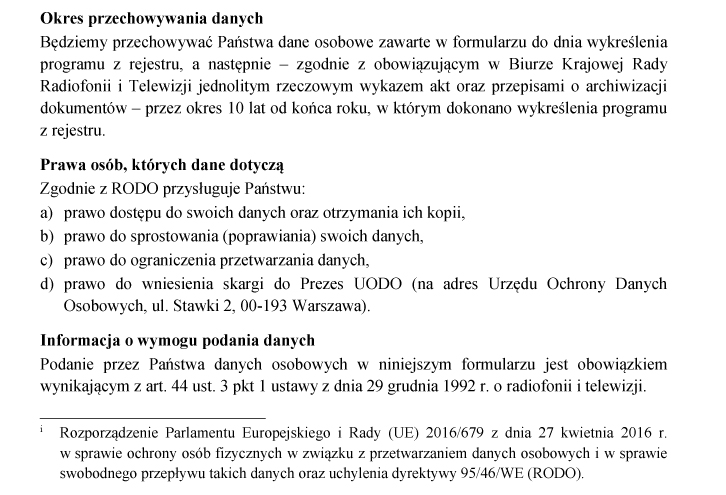 4) rubryka czwarta - nazwa i siedziba nadawcy programu;
