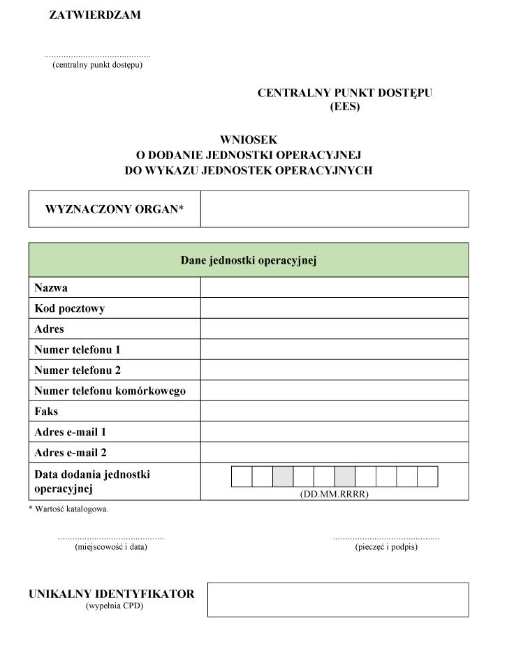 5. Po zatwierdzeniu wniosku o dodanie jednostki operacyjnej do wykazu jednostek operacyjnych, CPD umieszcza na wniosku unikalny identyfikator i odsyła wniosek do kierownika wyznaczonego organu.