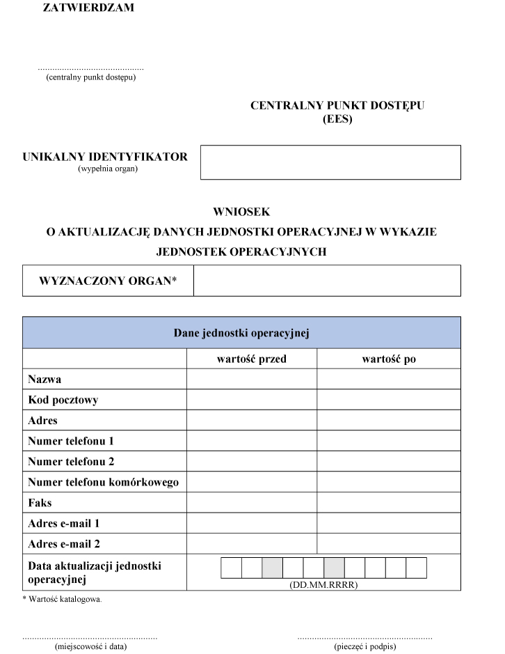 WZÓR - WNIOSEK O AKTUALIZACJĘ DANYCH JEDNOSTKI OPERACYJNEJ W WYKAZIE JEDNOSTEK OPERACYJNYCH WYZNACZONY ORGAN