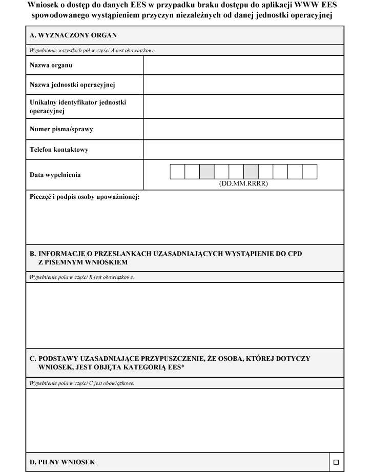 WZÓR - WNIOSEK O DOSTĘP DO DANYCH EES W PRZYPADKU BRAKU DOSTĘPU DO APLIKACJI WWW EES SPOWODOWANEGO WYSTĄPIENIEM PRZYCZYN NIEZALEŻNYCH OD DANEJ JEDNOSTKI OPERACYJNEJ