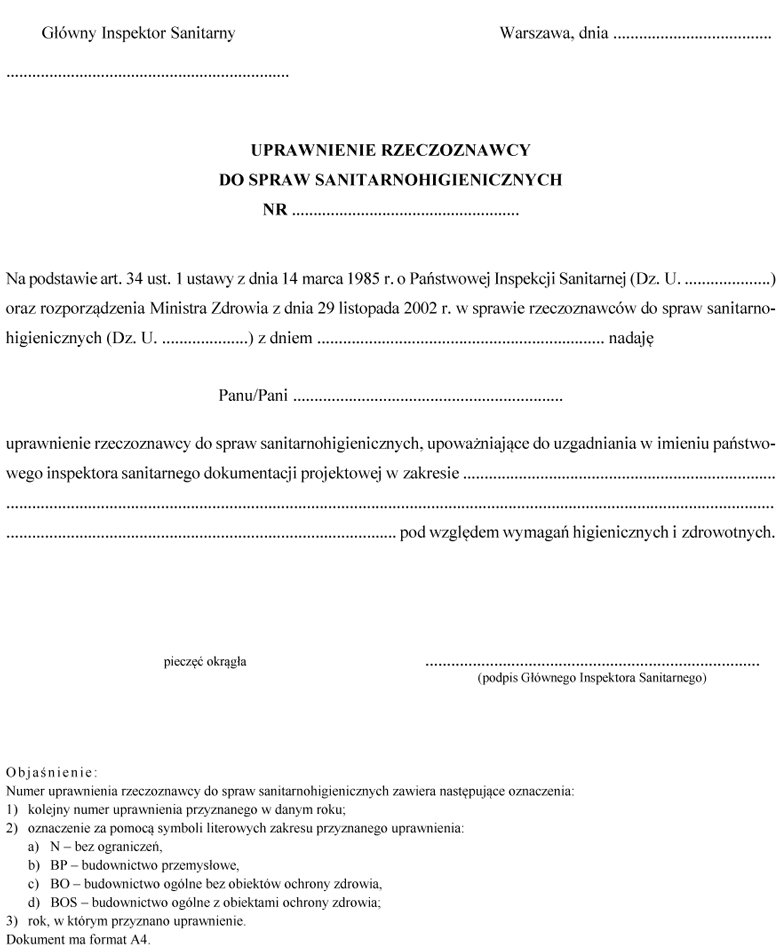 WZÓR - UPRAWNIENIE RZECZOZNAWCY DO SPRAW SANITARNOHIGIENICZNYCH