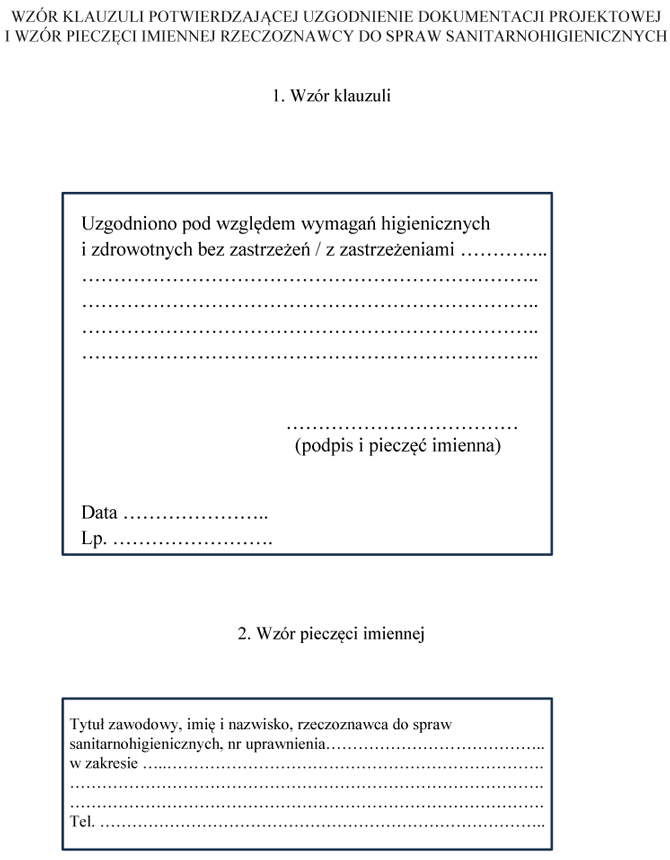 WZÓR KLAUZULI POTWIERDZAJĄCEJ UZGODNIENIE DOKUMENTACJI PROJEKTOWEJ I WZÓR PIECZĘCI IMIENNEJ RZECZOZNAWCY DO SPRAW SANITARNOHIGIENICZNYCH