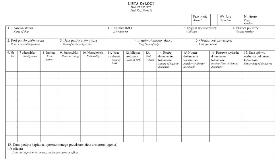 e) lista załogi - wzór formularza jest określony w załączniku nr 6 do rozporządzenia,