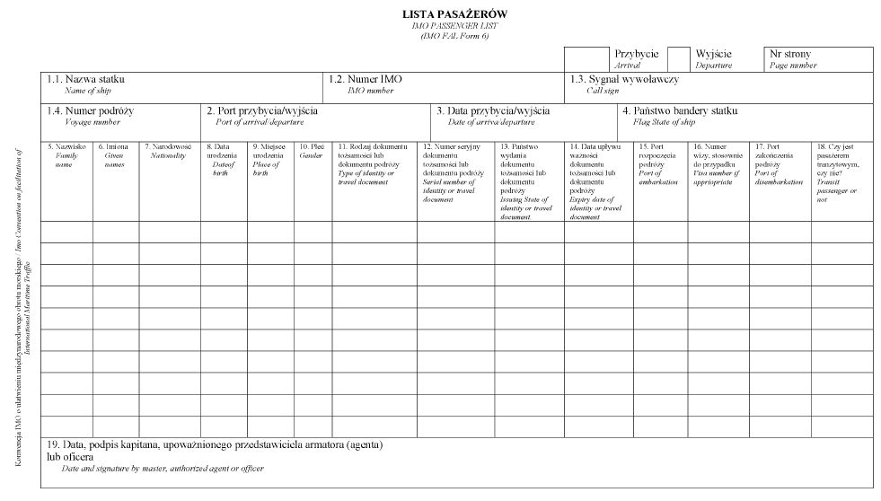 f) lista pasażerów - wzór formularza jest określony w załączniku nr 7 do rozporządzenia,