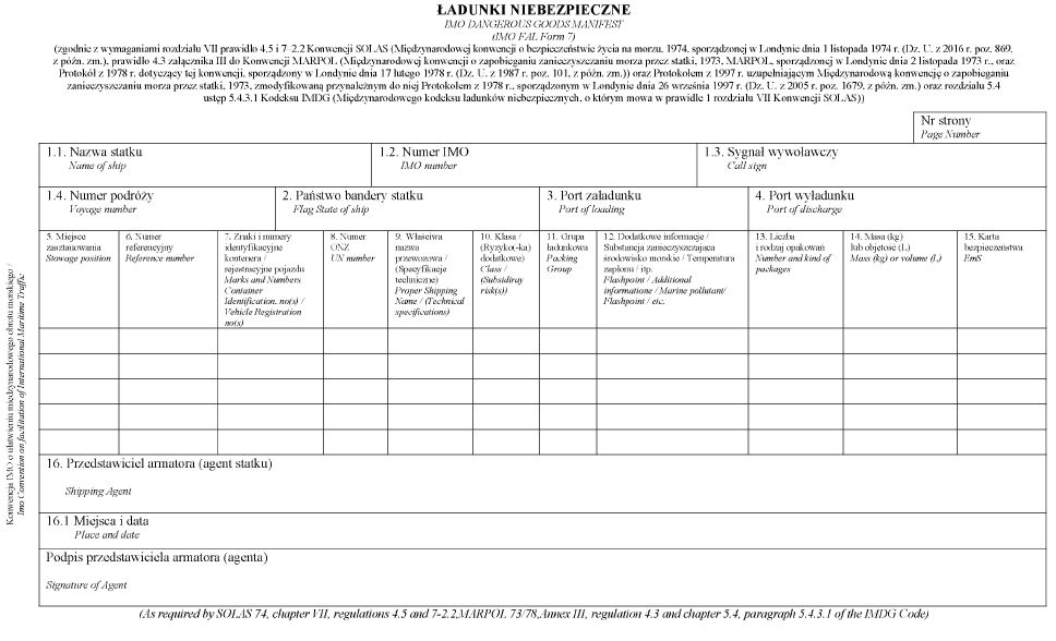 g) ładunki niebezpieczne - wzór formularza jest określony w załączniku nr 8 do rozporządzenia,